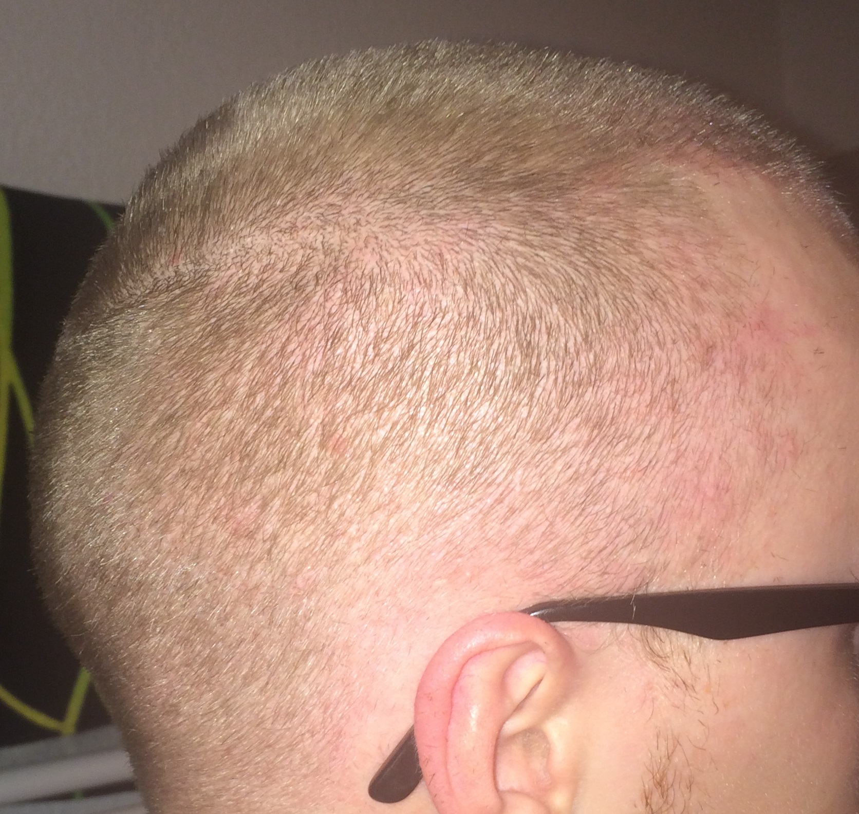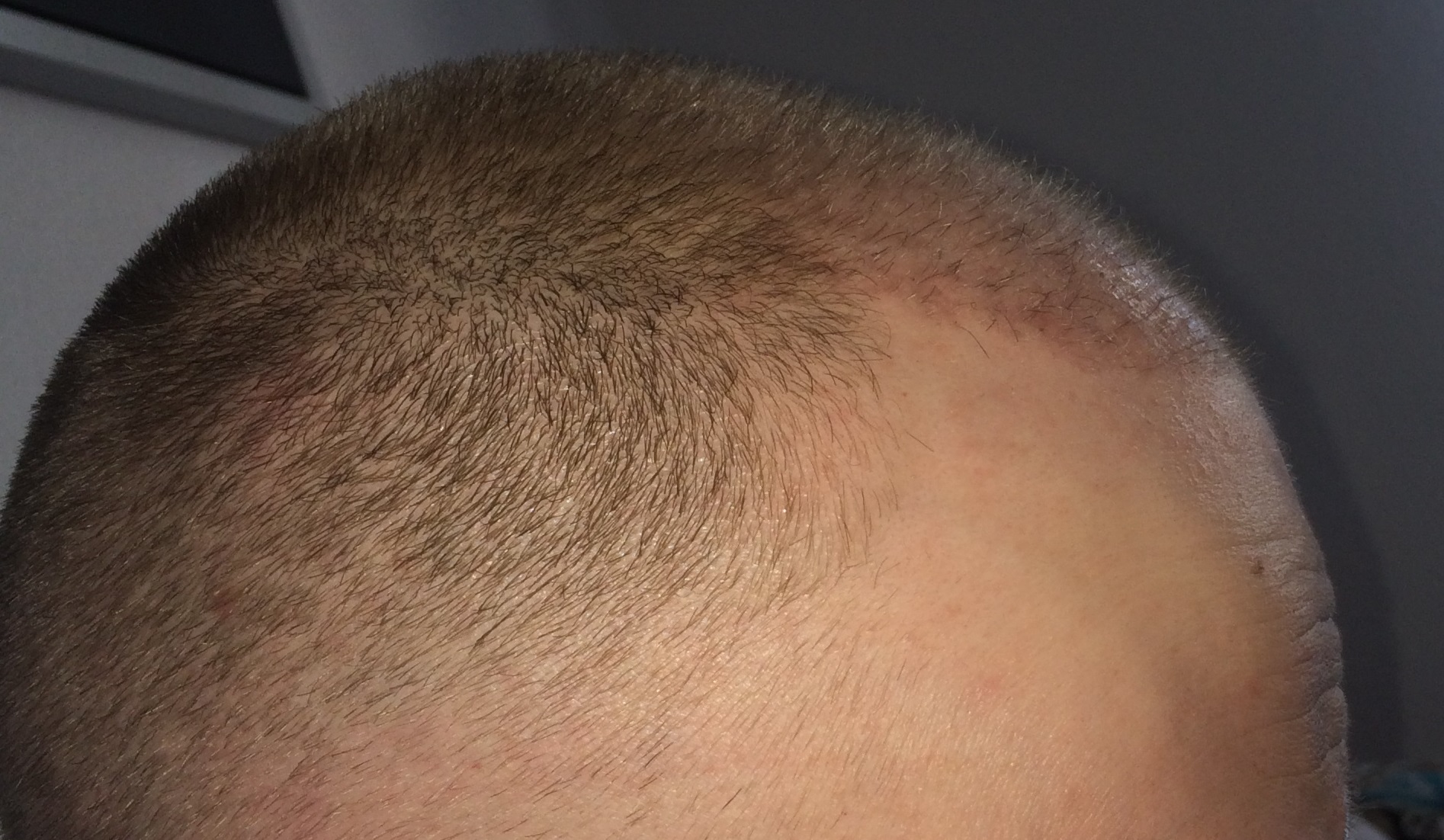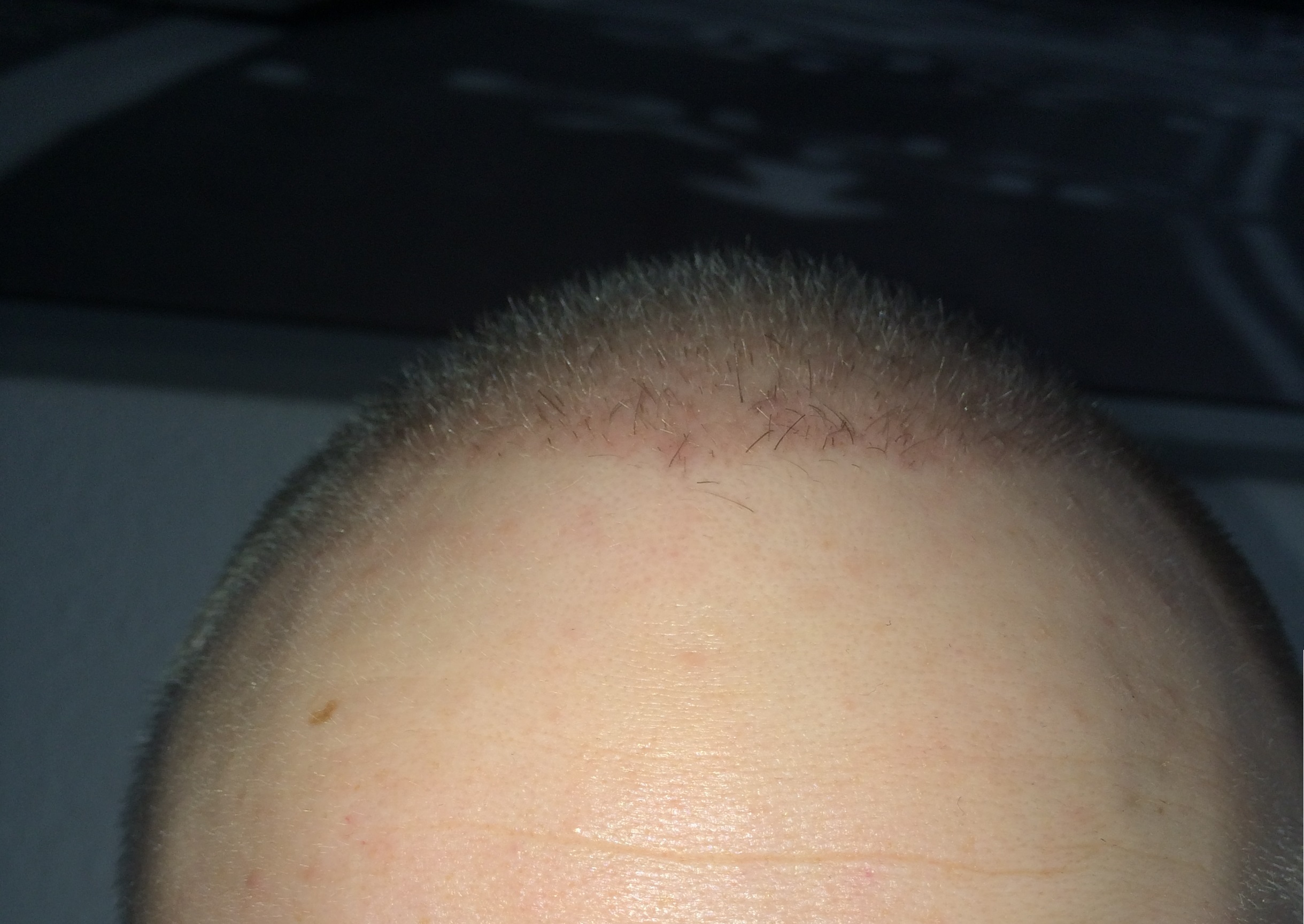 Seit dem letzten Update hab ich meine Haare nur noch an den Seiten geschnitten den Rest habe ich mal 2 Wochen sprießen lassen. Es ist schon ein wenig was gekommen leider sind die Haare noch sehr fein und hell, sehen aus wie Babyhaare... dementsprechen sehr schwer auf Bildern einzufangen. Ich habe die Bilder einfach mal mit Blitz gemacht, gerade nach meinem fachmännischen Haarschnitt und heißen dusche. Man kann die "Babyhaare" wohl durch den Blitz erahnen und ein paar dickere und dunklere sieht man definitiv ! Freue mich auf eure Kommentare und halte die Crowd natürlich auf dem Laufenden
