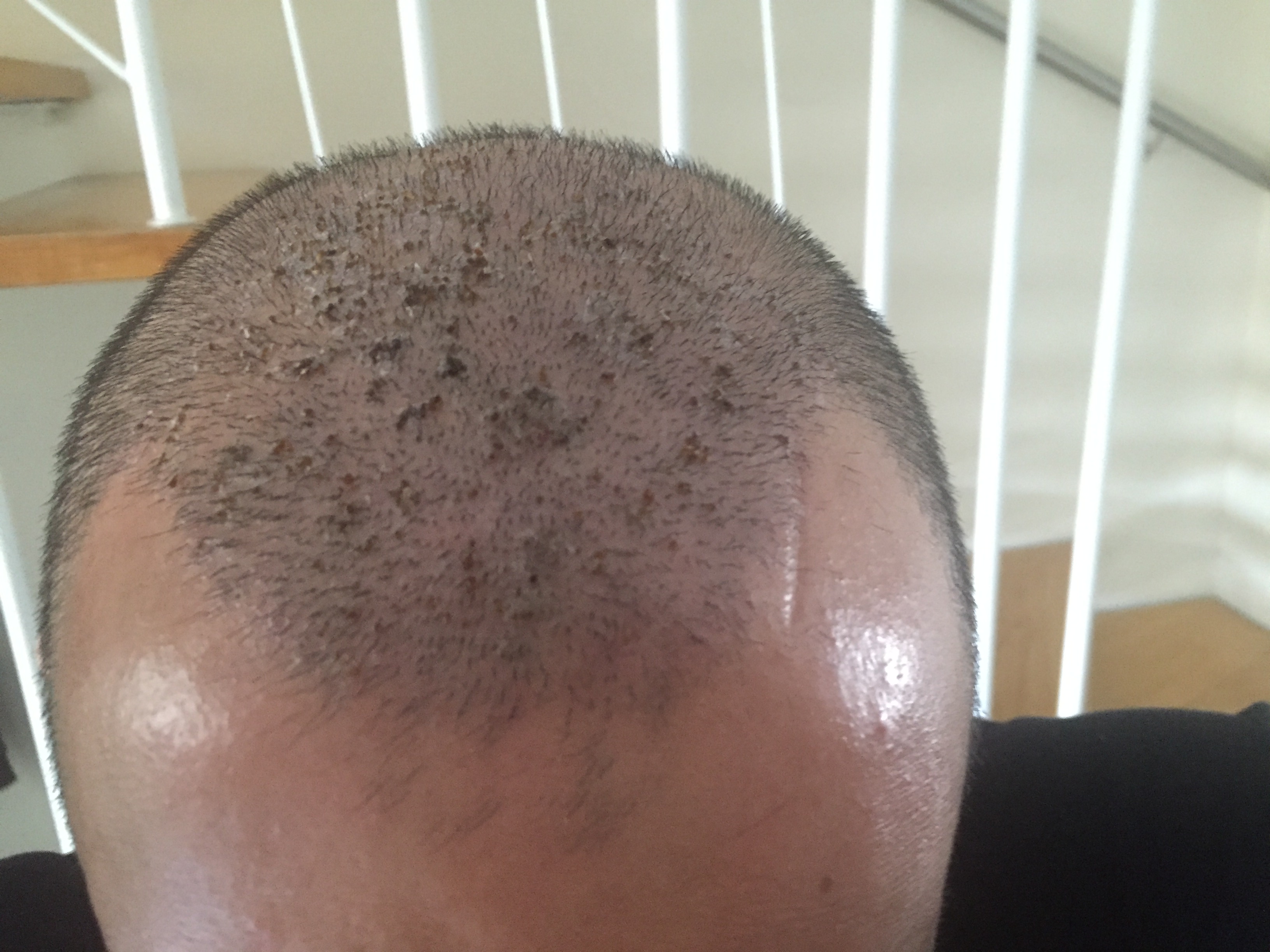 Seit dem 6.Tag Post-OP bis heute trage ich die Lotion auf dem Oberkopf auf und wasche sie anschließend vorsichtig wieder ab. Am 6. und 7. Tag habe ich die Lotion jeweils 1 Stunde einwirken lassen und die letzten Tage jeweils 5 Stunden. Laut der Anweisung des Arztes muss die Lotion bis zum 10.Tag genutzt werden, wobei ich sie in den nächsten Tagen wahrscheinlich weiter auftragen werde, bis die Krusten vollständig abgefallen.