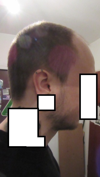 Behandelt werden sollen primär die Geheimratsecken, inklusive den dünnen Bereichen vorne und die kleine kahle Stelle oben am Wirbel.