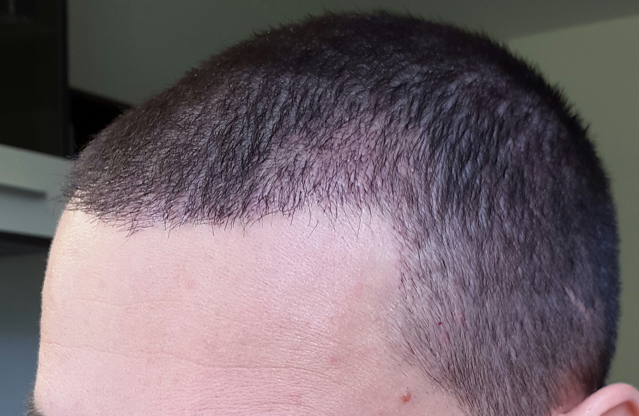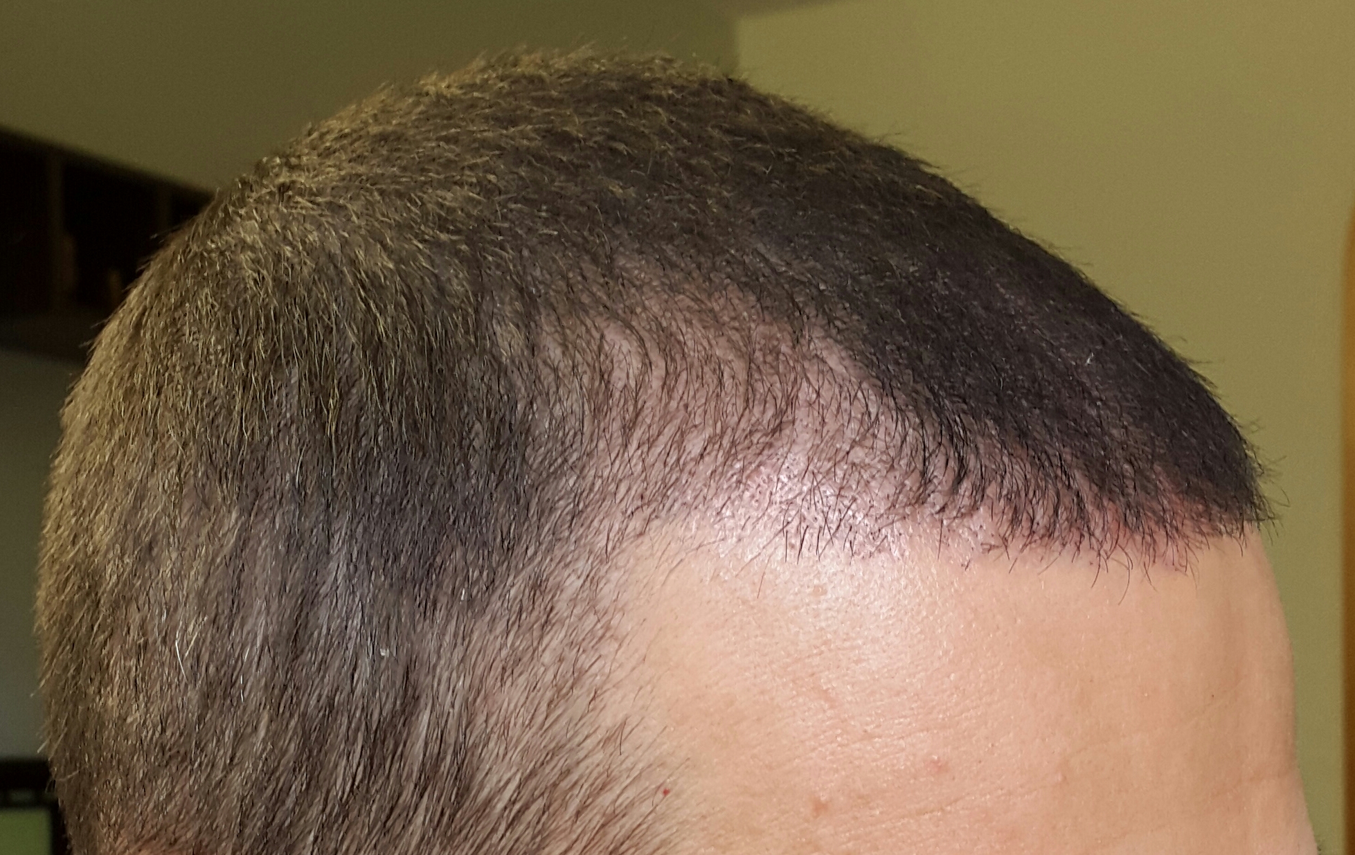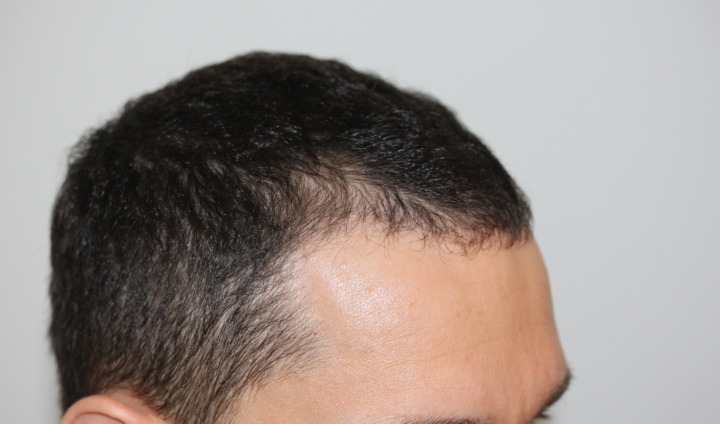 Die Geheimratsecken sind kaum noch licht. Ständig neuer Haarwachstum zu beobachten. Neue Haarlinie noch nicht dicht, aber deutlich zu erkennen.