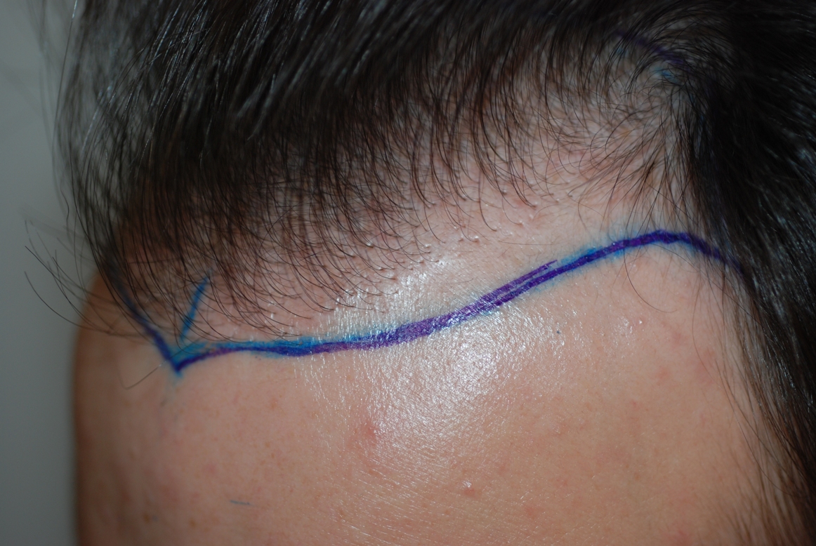 Im Gespräch mit dem Arzt wurde unter anderem meine Donorbeschaffenheit analysiert und die Dichte gemessen. Der Arzt zeichnete aus dem Gefühl heraus eine erste vorläufige Haarlinie ein, welche mit Hilfe einer Schablone, die den Abstand vom obersten Punkt der Augenbrauen zur zukünftigen Haarlinie misst, und unter Berücksichtigung meiner Gesichtskonturen noch verfeinert wurde.