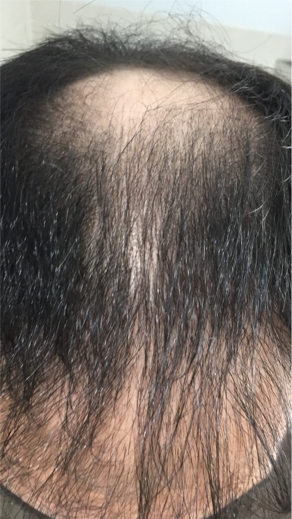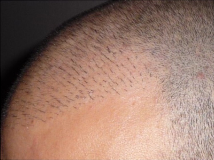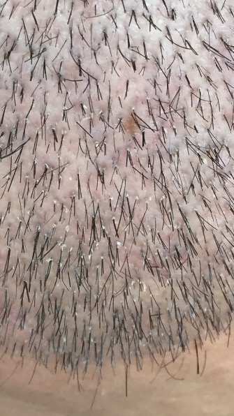 Bemerkenswert finde ich, dass die Wuchsrichtung eingezeichnet wurde, und das vor der Rasur, vermutlich, um diese besser zu erkennen.