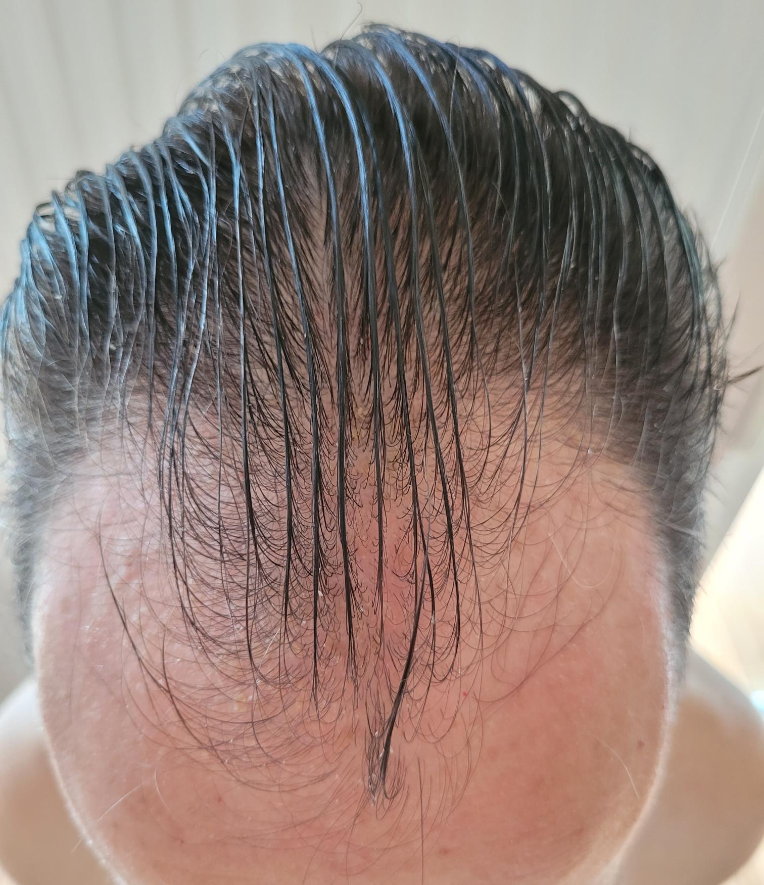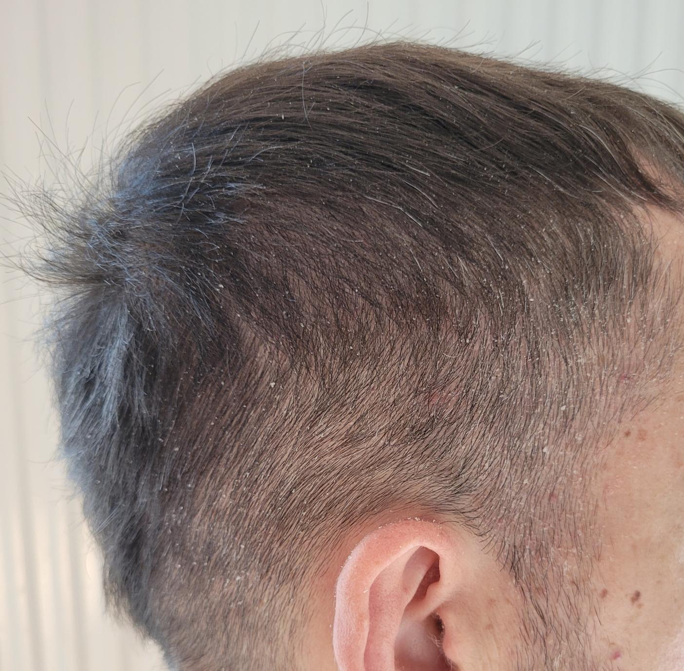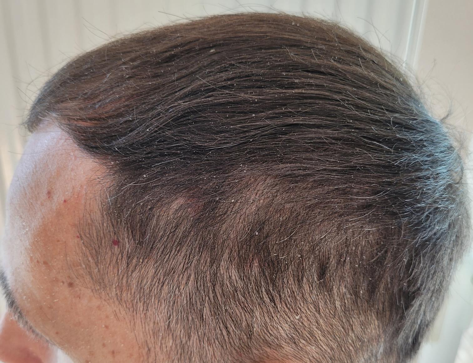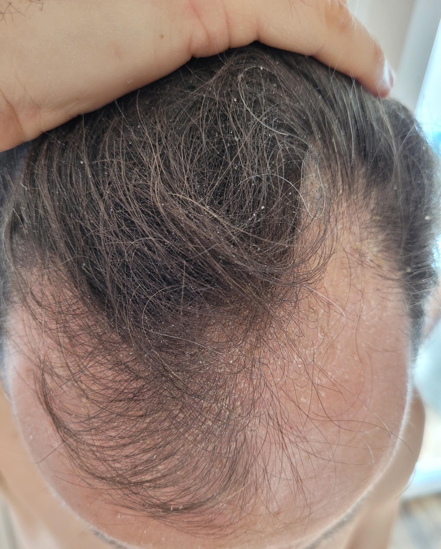 Der Hinterkopf ist komplett frei von irgendwelchen Problemen. Nun ist es die Oberseite. Allerdings ist es anders wie damals auf dem Hinterkopf. Hier ist es eher, dass die Haut immer mal wieder sehr trocken ist. Aber kein Juckreiz oder konzentrierte schuppige Stellen.