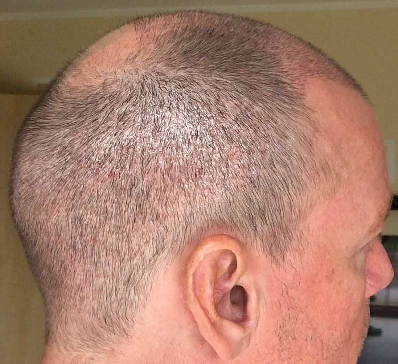 Ich bin mit der derzeitigen Situation sehr zufrieden, mit den verpflanzten 3.673 Grafts wurde hauptsächlich der vordere & obere (sichtbare) Bereich aufgefüllt.