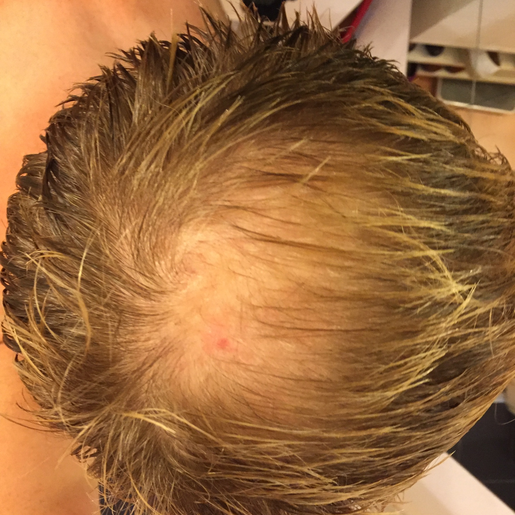 Die roten Punkte/Flatschen auf dem Kopf meinst Du, oder?