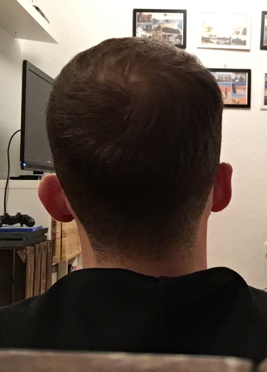 Mütterlicherseits wird es bei den Männern im Alter auch hinten etwas lichter, wobei ich eher nach meinem Vater komme und das denke ich recht normal ist im Alter. Wie gesagt, eventuell muss ich dann in 10 Jahren oder so vielleicht nochmal über hinten nachdenken.