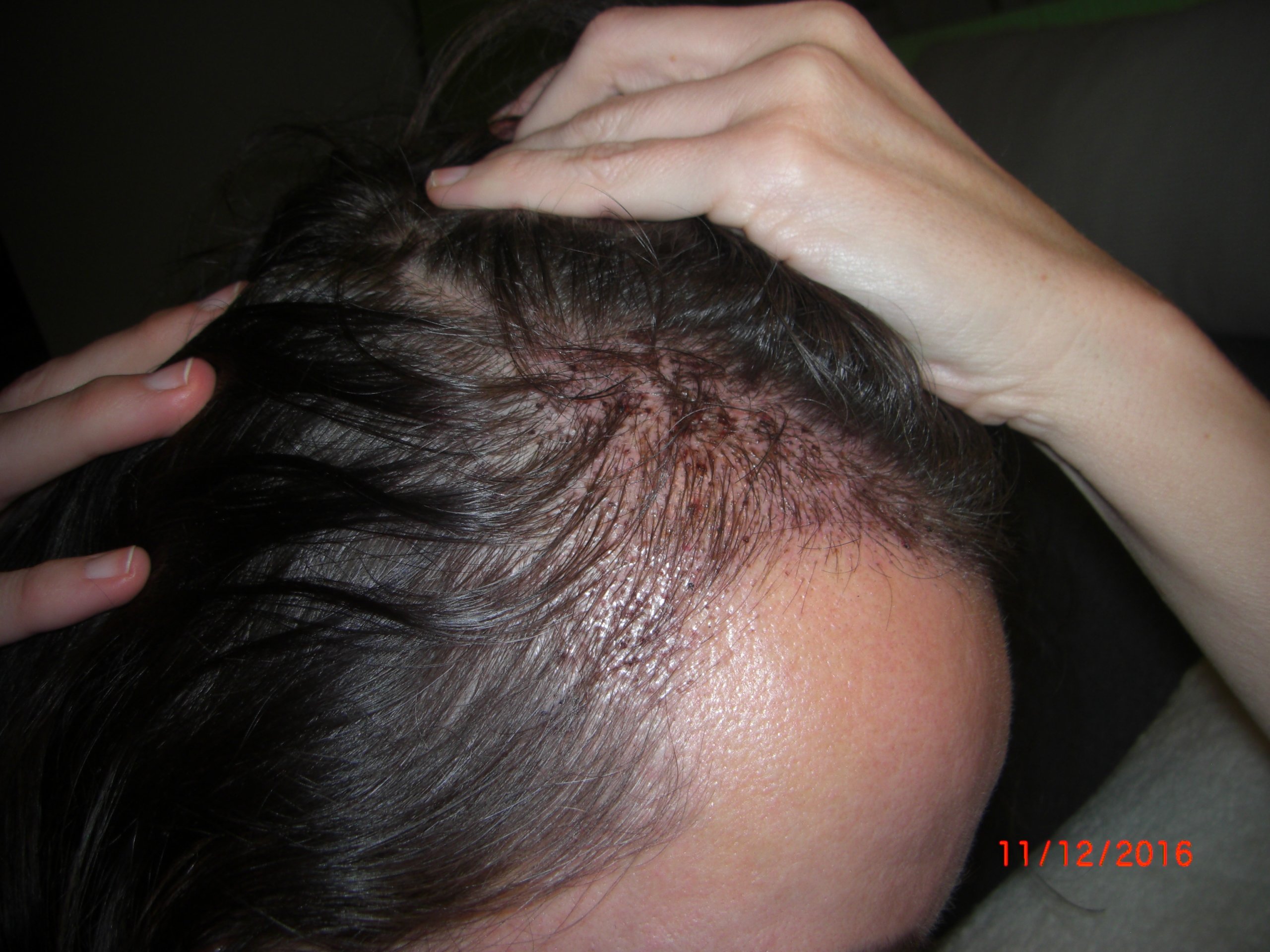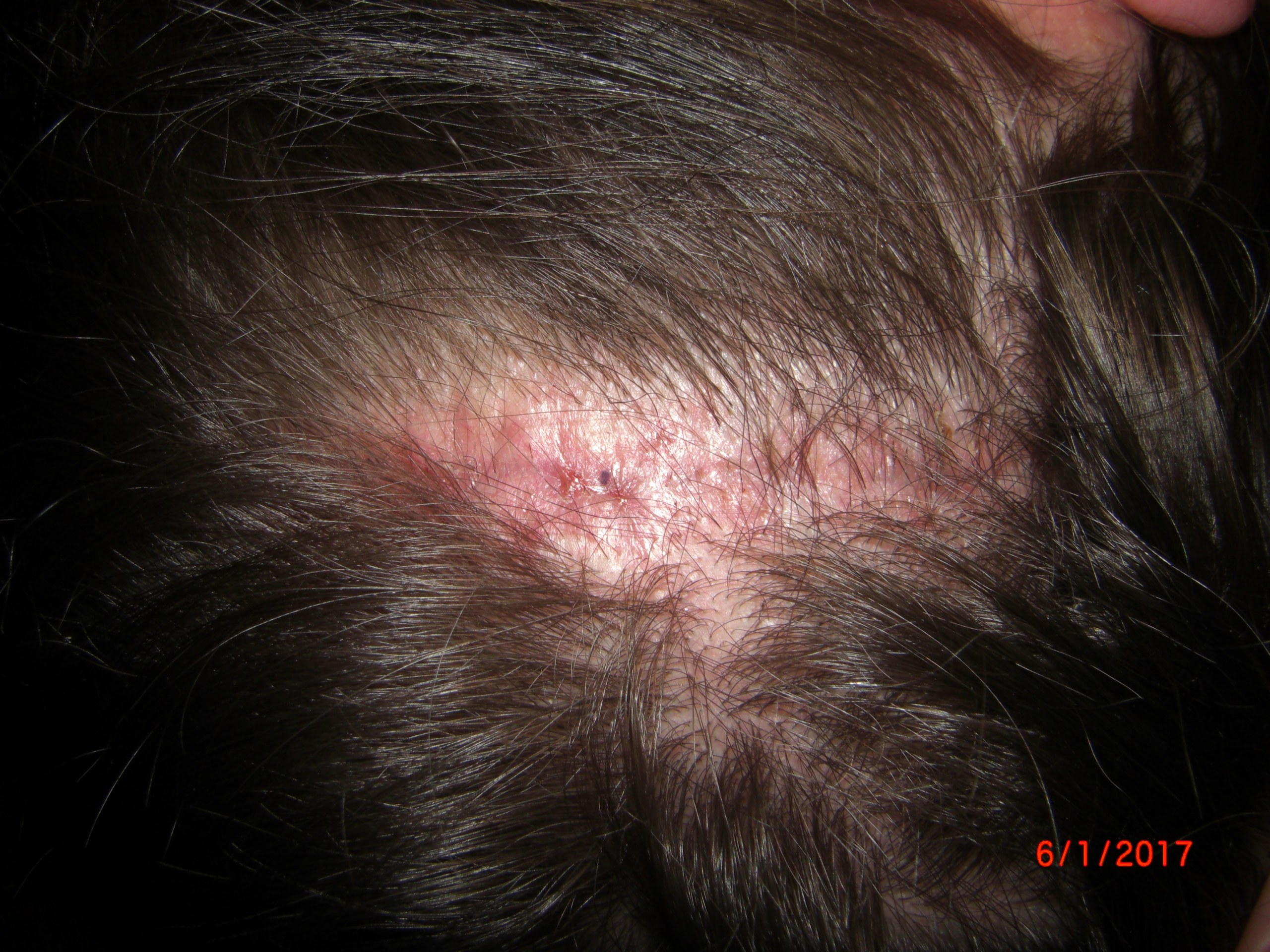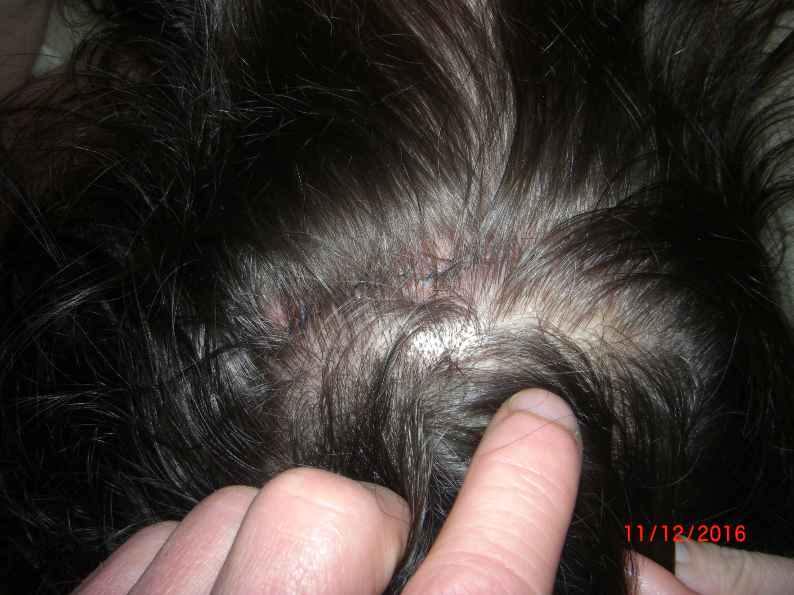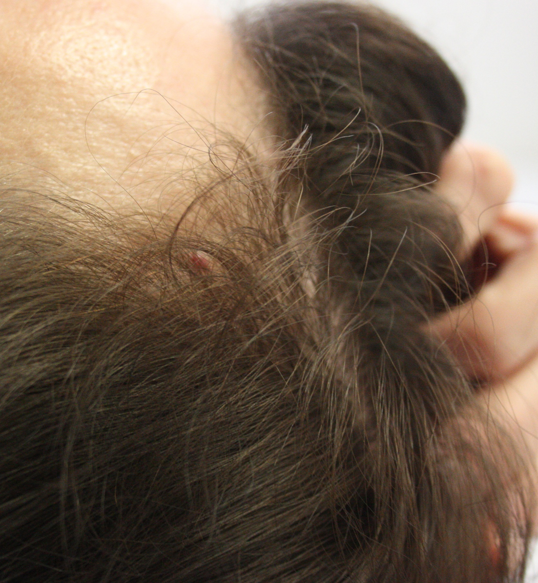 Die Woche 5 nach der OP! Nervig waren diese Eiterpusteln, die sich ab und zu bildeten. Ihr seht - fast keine Haare mehr da. Das war eine schlimme Zeit. Die kahlen Stellen konnte ich kaum kaschieren....Auch hatte ich an der Narbe eine kleine Stelle, die nicht so gut verheilt ist. Diese Stelle ist nun heute als Narbe ein bisschen breiter, der Rest der Narbe ist kaum zu sehen.