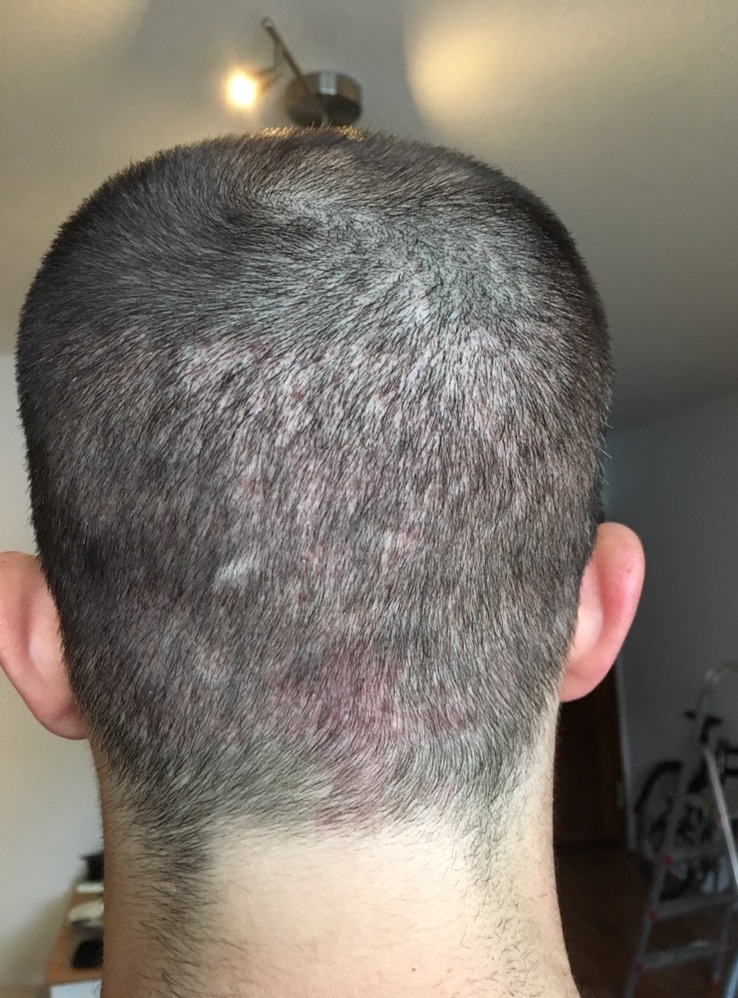 juckreiz nur noch sporadisch, wenn ich lange auf dem hinterkopf liege. rötung sieht man auch immer weniger. schmiere es immer wieder mit aloe vera gel ein, vor allem wenn es juckt- das bringt dann linderung.