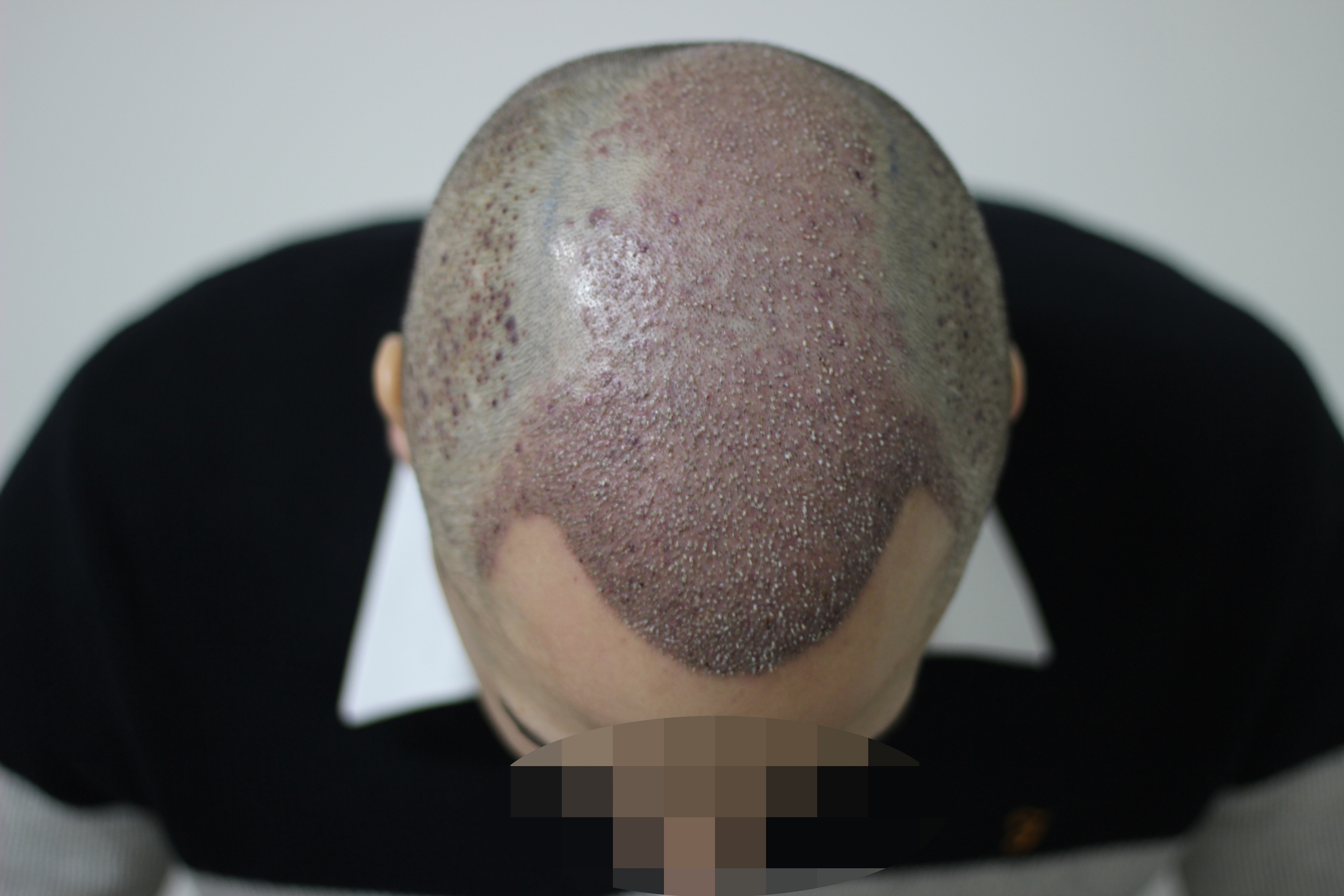 Wie am ersten Tag. Jedoch Entnahme am Hinterkopf. Grafts dann der Rest (ca. 2000). Einsatz in der Midline und am Vertex sowie auch weitere in der Front.