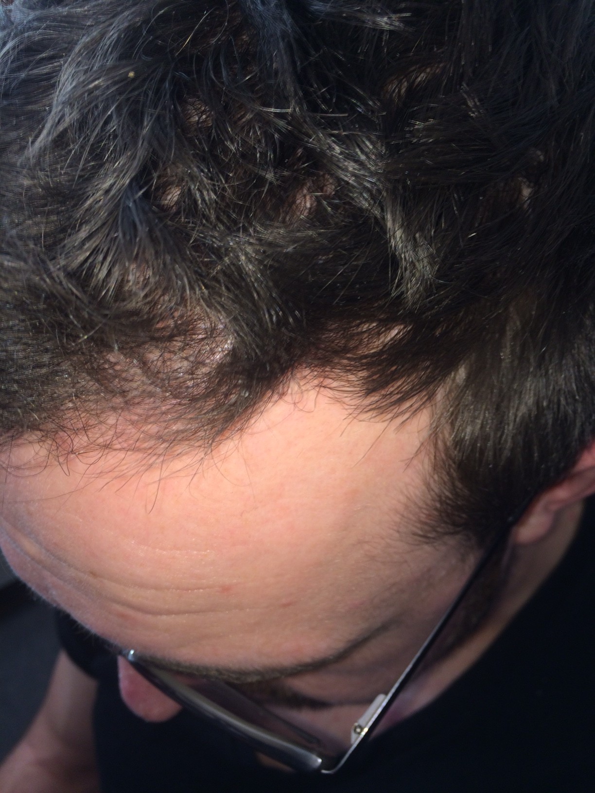 Anbei auch noch ein Bild von der anderen Seite. Rechts ist es bei Blitzlicht "schlechter", zumindest finde ich dass da die Kopfhaut stärker durchscheint. Gründe kenne ich nicht. Es sieht aber bei normalem Tageslicht nicht besonders anders aus...