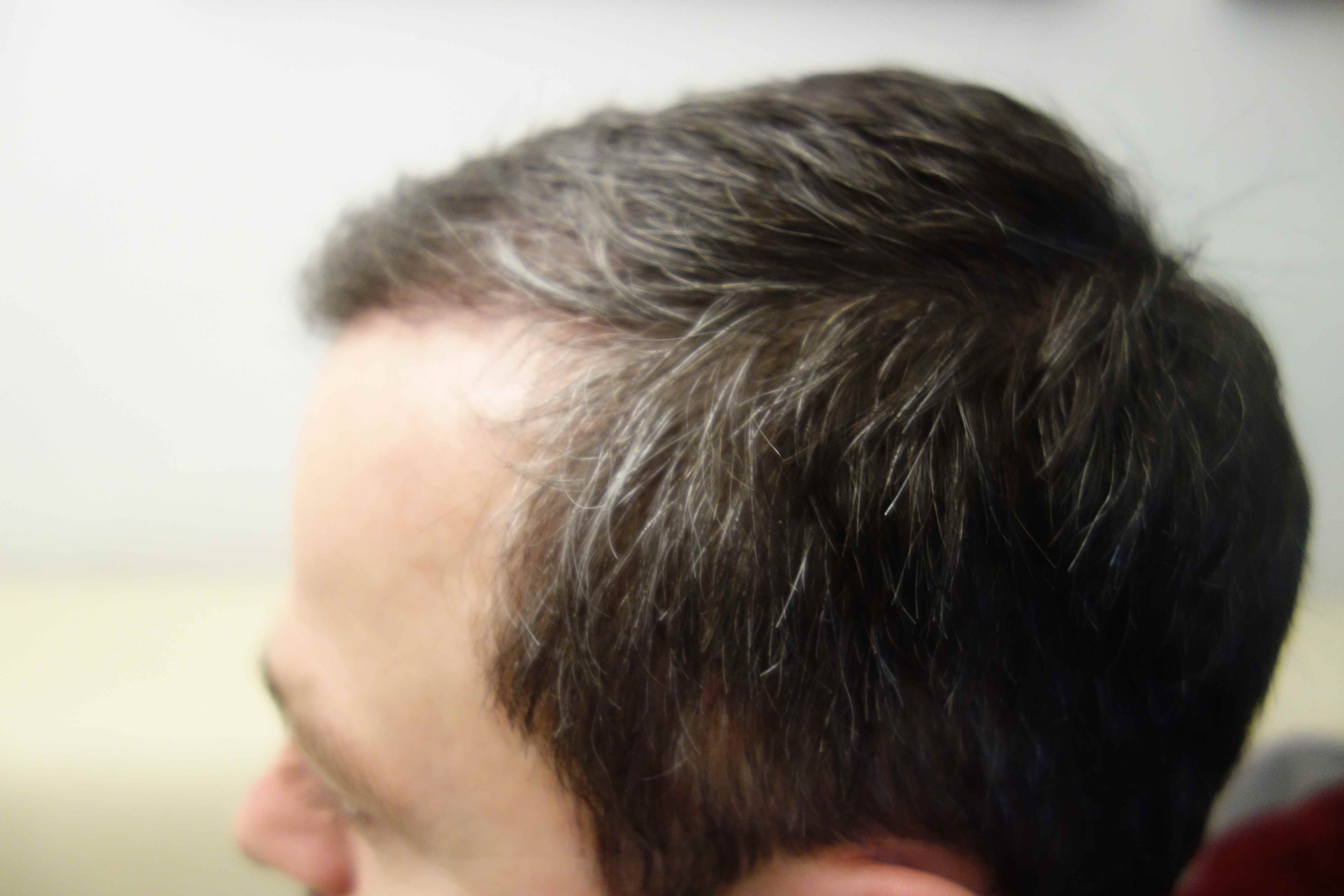 Einziges Manko, was ich gestern Abend zu Hause gesehen habe ist, dass die transplantierten Haare im Schläfenbereich sich borstiger anfühlen und auch dunkler sind. Da ich aber eine herbstliche Farbgebung auf meinem Kopf habe (dunkelbraun - hellbraun - weiß) und auch die Dichte da sehr variiert (lag nicht an der HT, war schon vorher so) ist das für andere nicht wirklich sichtbar. Aber Tatsache ist, dass der Schläfenbereich sich vom restlichen nativen Haar unterscheidet.