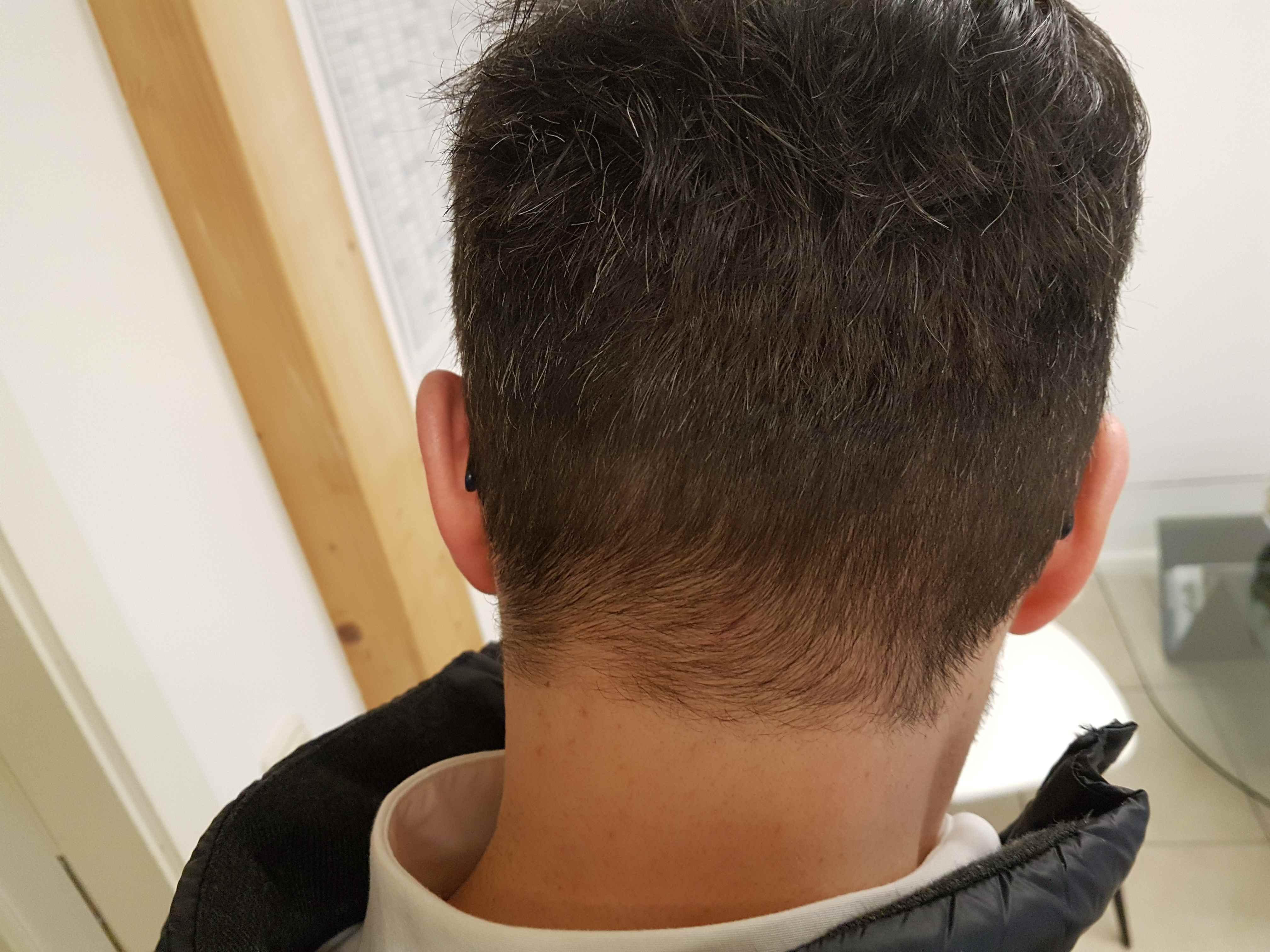 Die Narbe ist so nicht mehr sichtbar, teilweise durch die leichte Wulst aber noch ertastbar. Hier spielen meines Erachtens für die gute Narbenheilung mehrere Komponenten zusammen, wichtig ist der Narbenverschluß welcher Doc Muresanu mit dem Assitierenden Arzt gut hinbekommen hat (man erkennt meines Erachtens auch bei anderen HattingenHair Kandidaten nach Dez. 2015 keinen Unterschied ob der Strip von Dr. Muresanu hauptverantwortlich gelöst und verschlossen wurde oder wie damals von Prof. Dr. Voy). Auch darf ich mich glücklich wissen, dass ich eine überdurchschnittliche Dichte habe und es somit ein leichtes ist diese zu überdecken. Mit der neuen Frisur entlang der Narbe sind die Haare von unter 1 cm bis ca. max. 1,5 cm lang und man sieht nichts, auch nicht im nassen Zustand. Was will ich mehr...