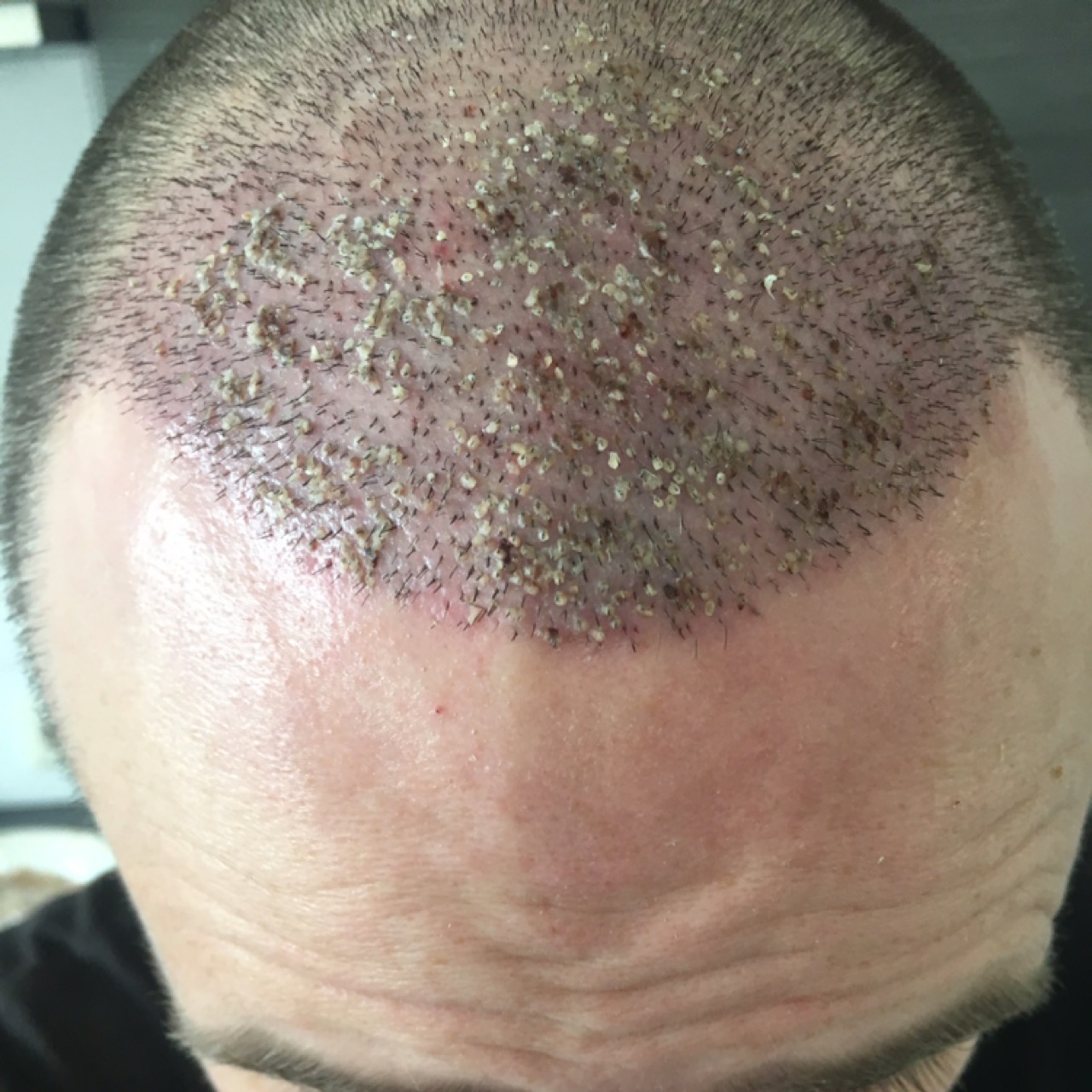 Zumindest kommen da auch schon Pickelchen. Das heißt, das eine oder andere transplantierte Haar sucht den Weg nach draußen...
