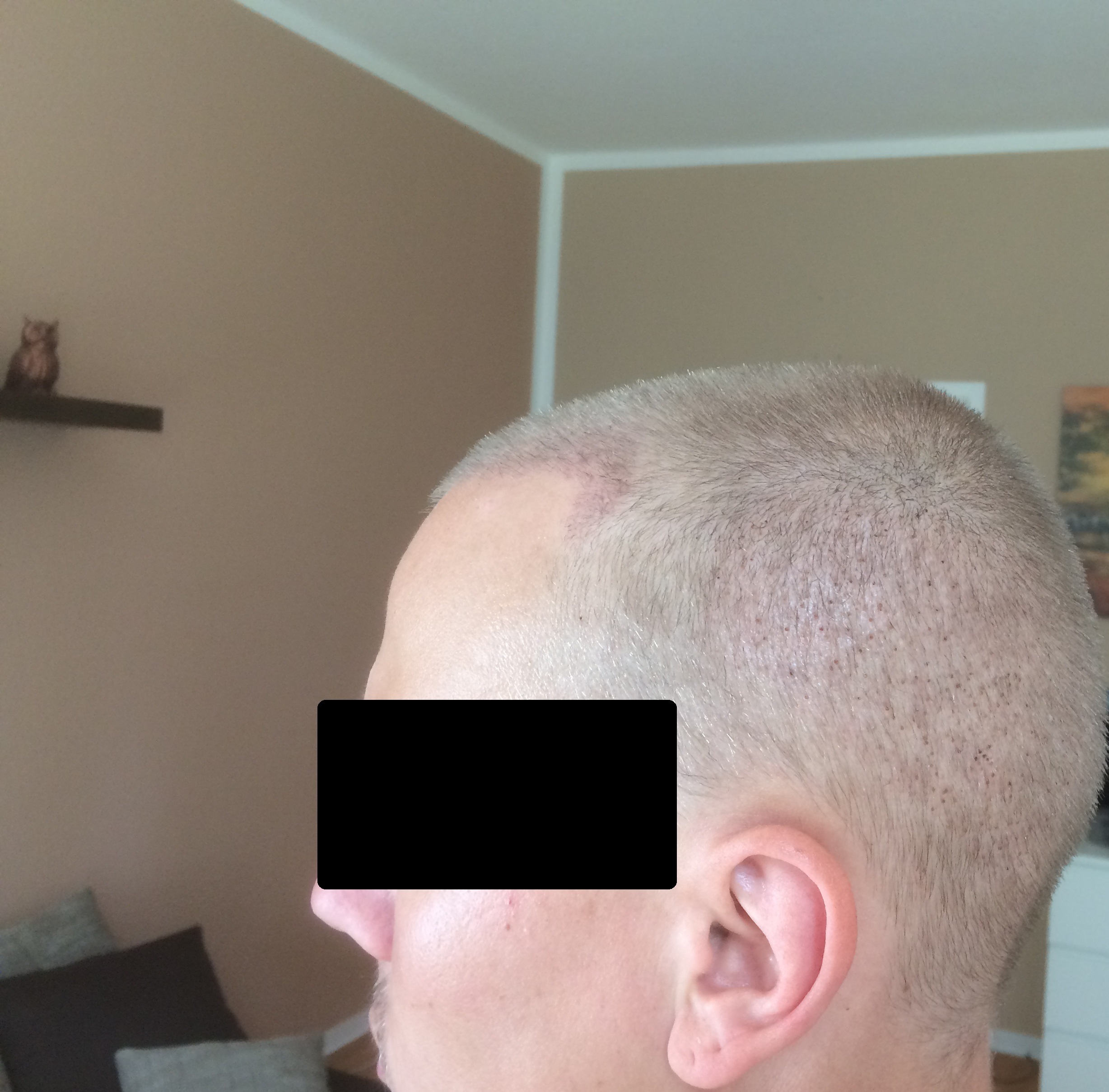 Wie Ihr sehen könnt, ist der Spenderbereich gut abgeheilt (ist noch ein bisschen empfindlich) und der Empfängerbereich sieht auch schon deutlich anders aus. Der Empfängerbereich ist zwar noch leicht gerötet, man sieht es jedoch in real gar nicht so stark wie auf den Fotos zu vermuten ist. Der Grind ging im Empfängerbereich bei jeder Haarwäsche ein bisschen ab.