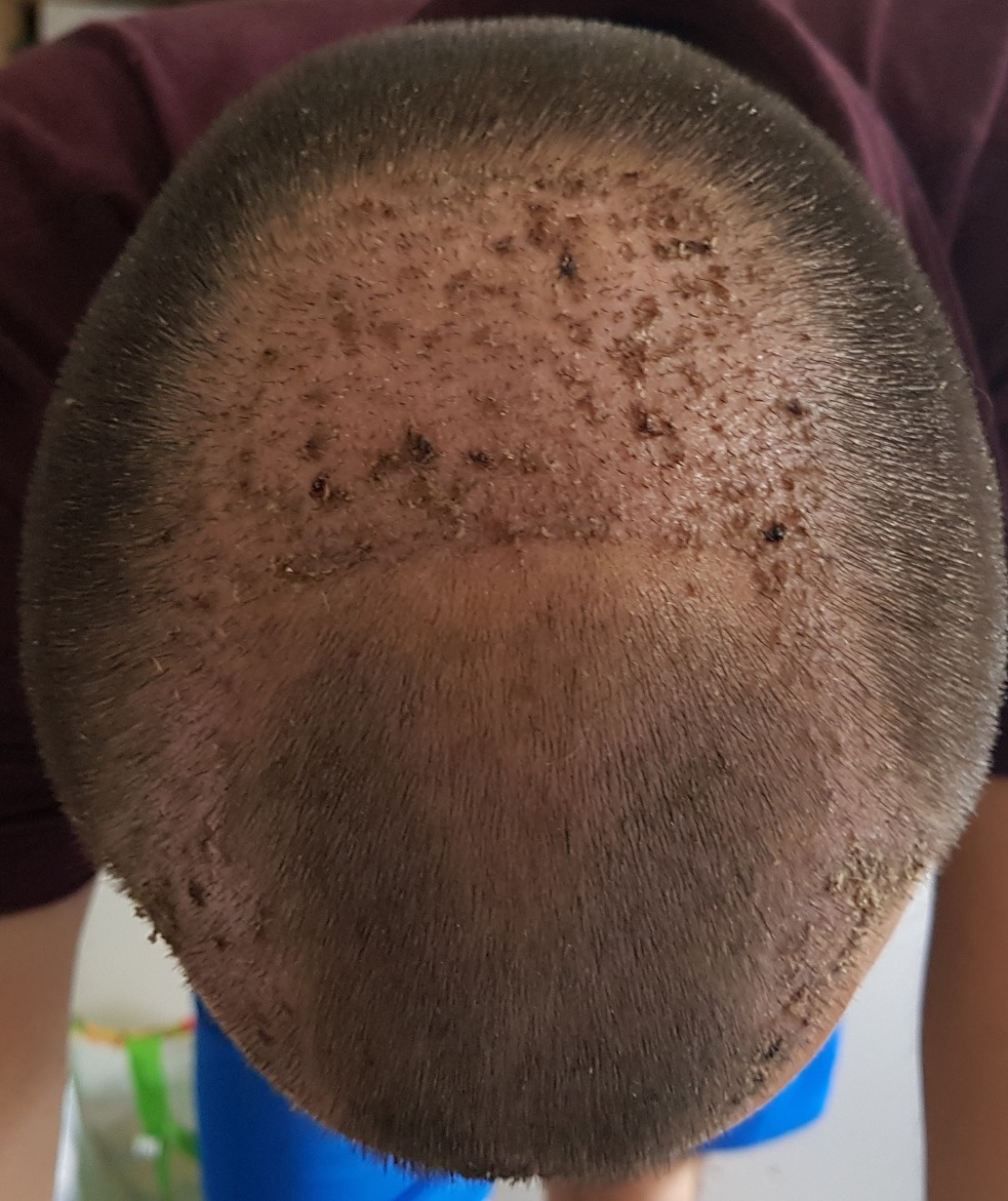 Ich finde man sieht schon, dass die neuen Haare ganz gut wachsen, wenn die Krusten einmal ganz weg sind, wird man das wohl auch besser sehen.