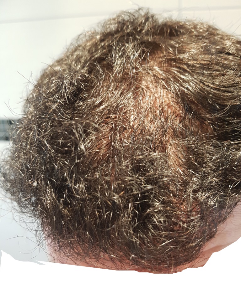 Wie man an den Vor-OP-Bildern sieht, hatten sich meine Geheimratsecken so weiterentwickelt, dass vorne nur noch ein Haarbüchel geblieben war. Zudem begann sich meine Tonsur zu lichten.