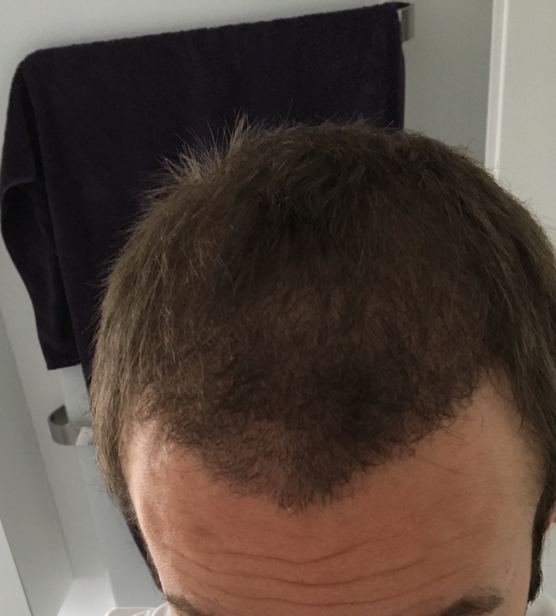 Wie gesagt, vorne hatte ich hellere Haare. Hab ich ja gesagt. Hinten und seitlich war es davor schon dunkel. Siehe zweites Foto. Wenn nun von hinten verpflanzt wird, wird es dann halt vorne auch dunkler. 😉 Ich finde das auch nicht schlimm, da es jetzt besser zur augenbrauenfarbe und zum Bart passt. Im Sommer werden die Haare bei mir eh meist wieder blonder.