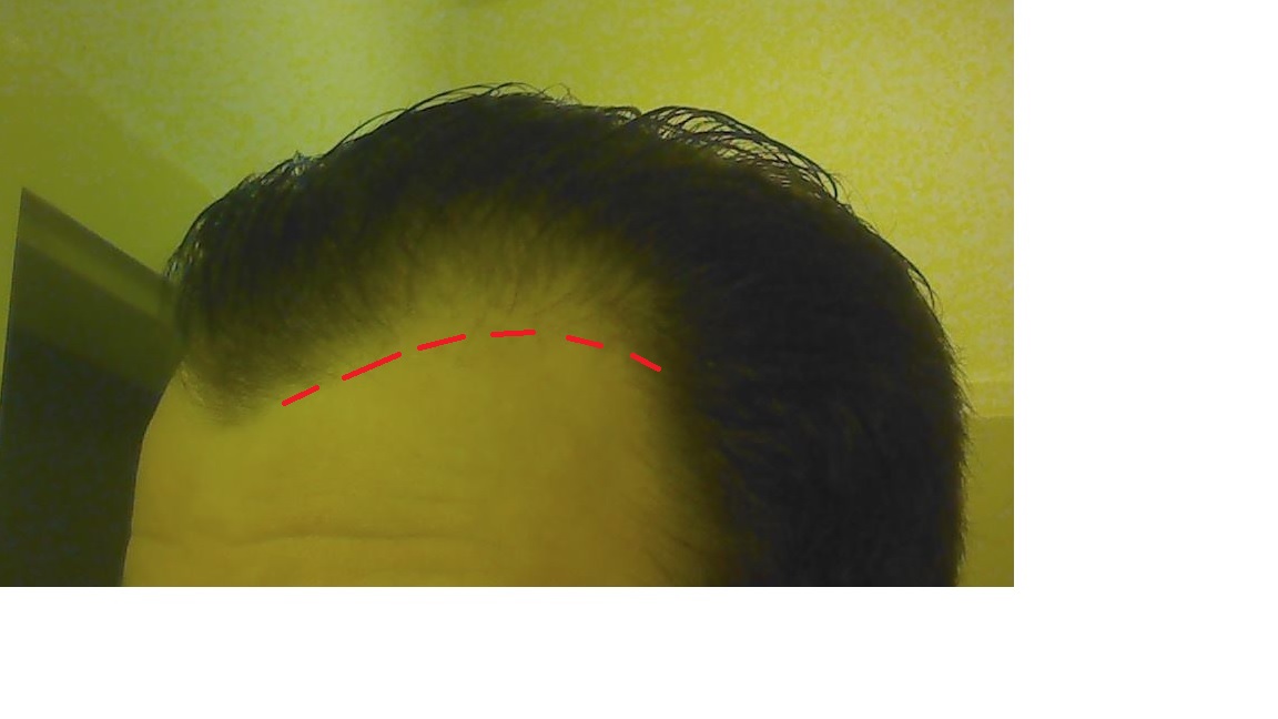 Bei folgenden Bildern habe ich meine Haare nass gekämmt, grundsätzlich ginge es mir um das Verdichten der undichten Stellen und das Wiederherstellen eines sauberen Haaransatzes. (siehe rote Linie im letzten Bild)