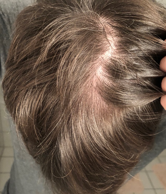 Das Bild von vorne, mit den Augenbrauen im Bild, ist gut, nur fehlt ein Maßstab (Maßband) zur orientierung. Grob: Bei Kaukasiern (Europiden) ist der Haaransatz im Bereich 7 bis 8,5 cm oberhalb der Augenbrauen; und geht ca 8 cm links und rechts der Mitte zu den Schläfen. D.h., eventuell sollte man auch Schläfen auffüllen.