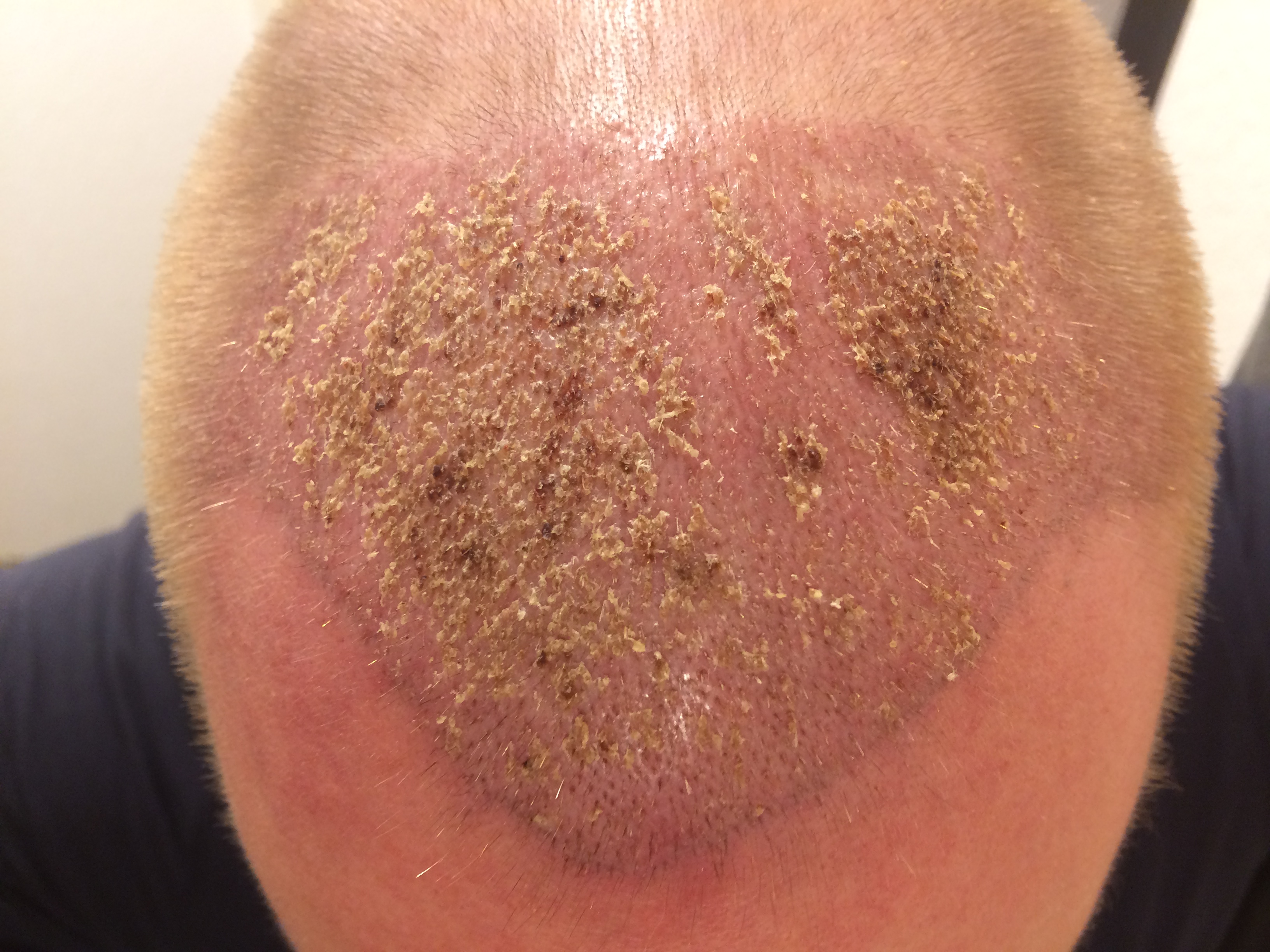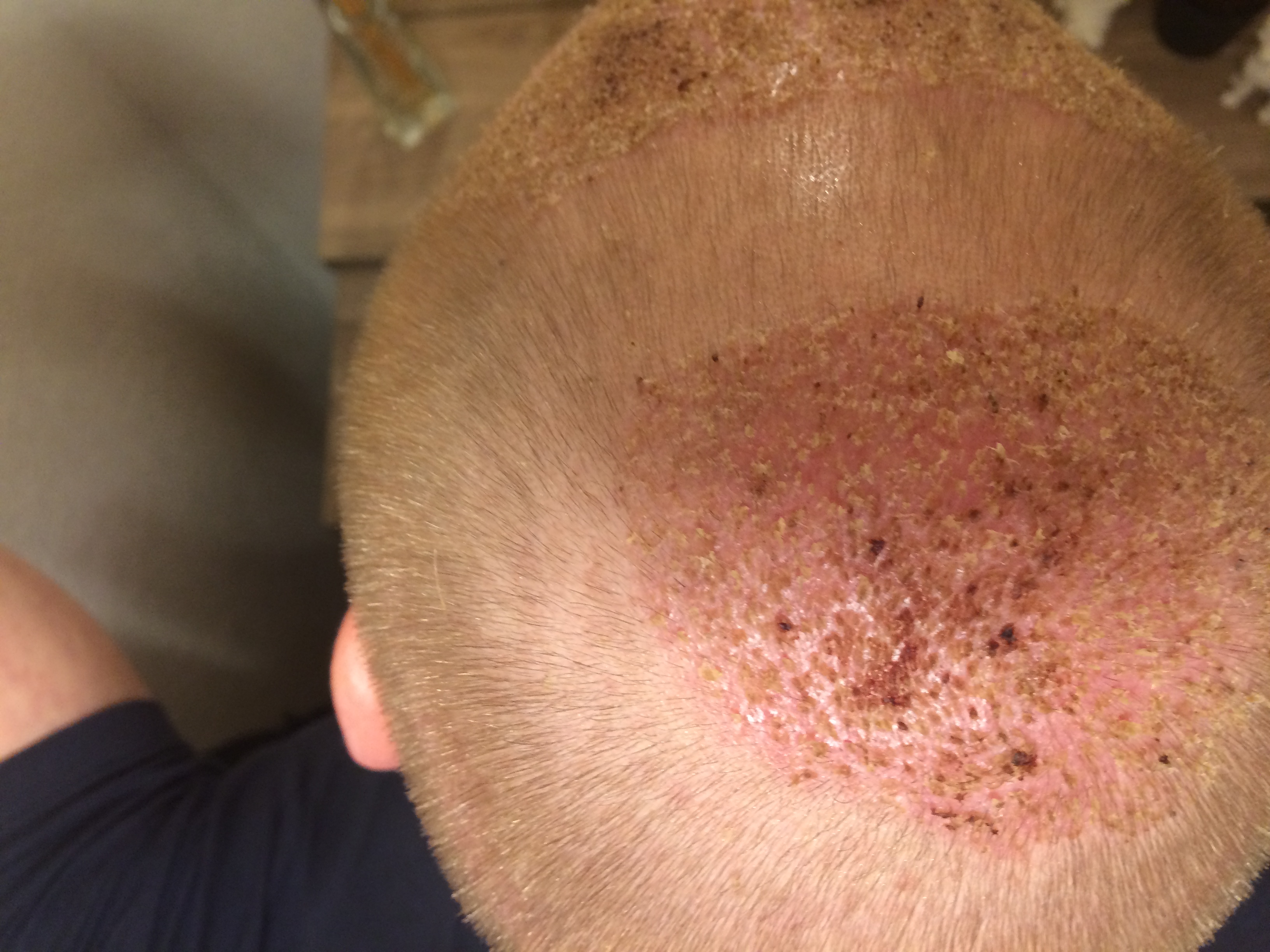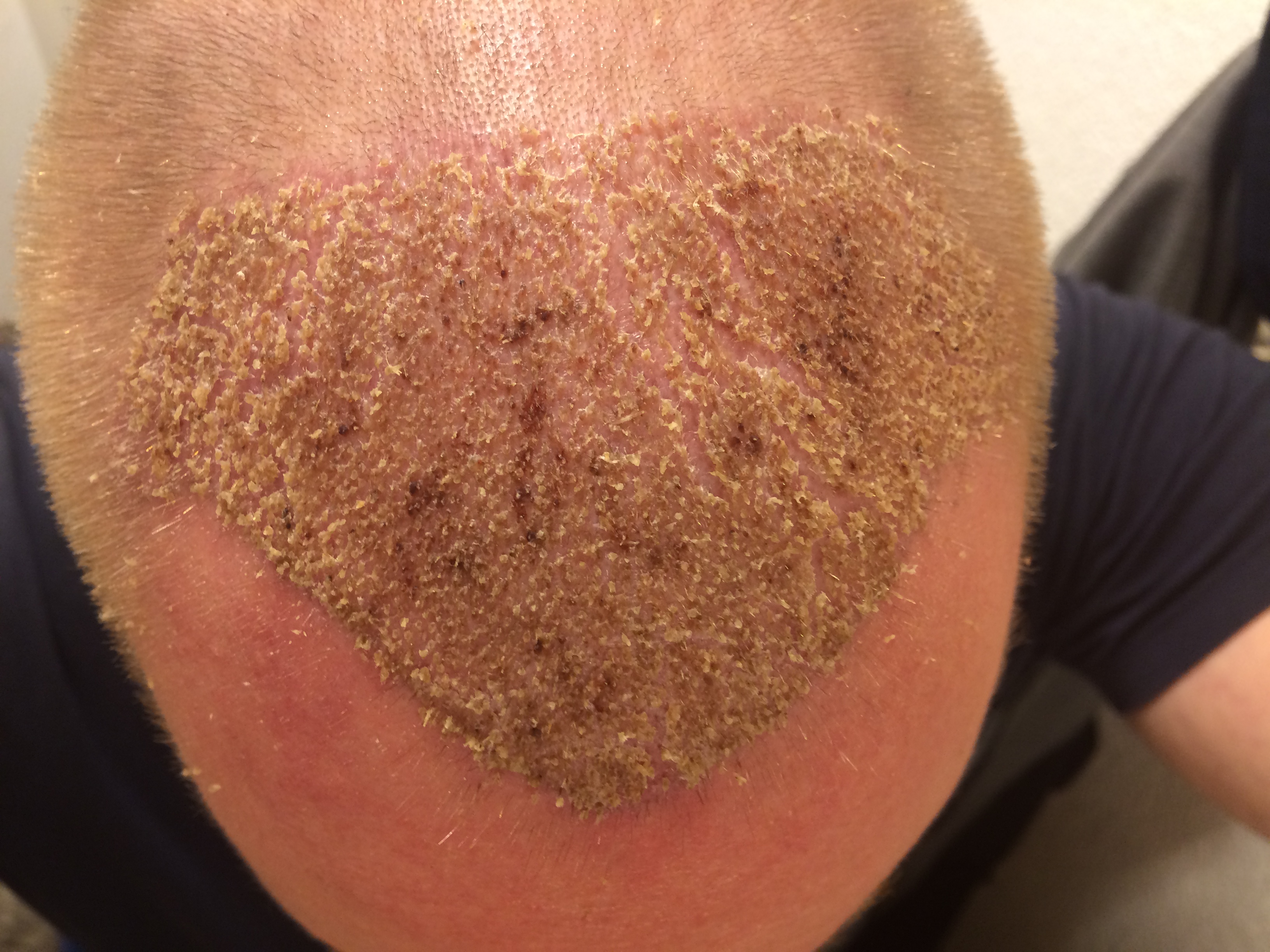 Ich habe mich bisher exakt an die Anweisungen der Klinik gehalten und auch die Waschprozedur nach Anleitung durchgeführt. Nach 10 Tage sollte ich eine "Waschpause" von einem Tag erfolgen, dies werde ich heute auch durchführen. Was mich stutzig macht, dass meine Krustensituatin noch sehr ausgeprägt ist und meiner Auffasung nach auch erst sehr spät begonnen hat. Bilder meiner heutigen Situation habe ich auch an die Klinik geschickt, diese wurde als "durchaus" normal analysiert. Mir wurde auch mittgeteilt, dass die Krusten ab dem 14 Tag der HT schaden und daher bis dahin abgeschlossen sein sollte. Über ein paar Meinungen/Erfahrungen würde ich mich freuen, bzw. einfach gern Eure Einschätzung wissen. (siehe Bilder)