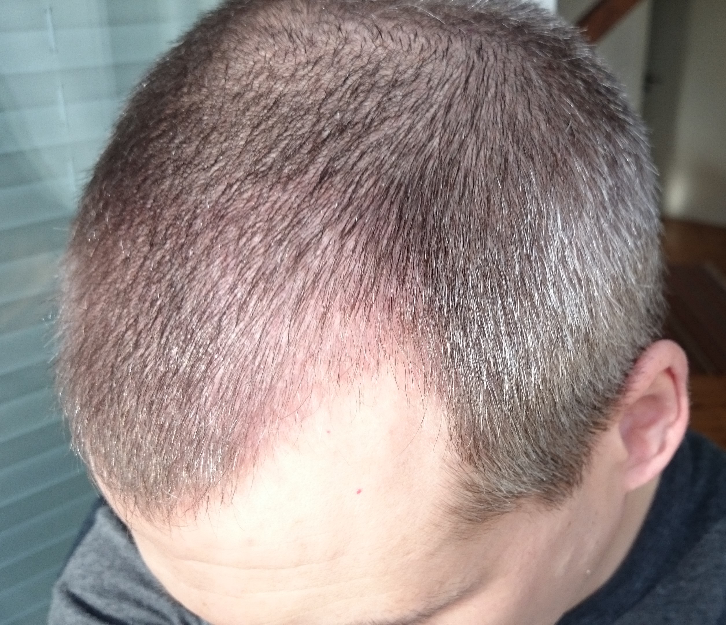 Ich habe die Haare heute auf 12 mm Länge gestutzt, um etwas Ordnung in die "Frisur" zu bringen. Wie man sieht, sind schon einige Haare gewachsen. Ich werte den Zwischenstatus erstmal vorsichtig als Erfolg. Schließlich heißt es in vielen Quellen, dass das Wachstum nach drei Monaten eigentlich erst richtig anfängt. Ich habe etwa einen Monat nach der OP angefangen, täglich zweimal Minoxidil auf die Kopfhaut aufzutragen. Mir wurde gesagt, dass dadurch die Haare schneller zu wachsen beginnen und es scheint sich bestätigt zu haben.