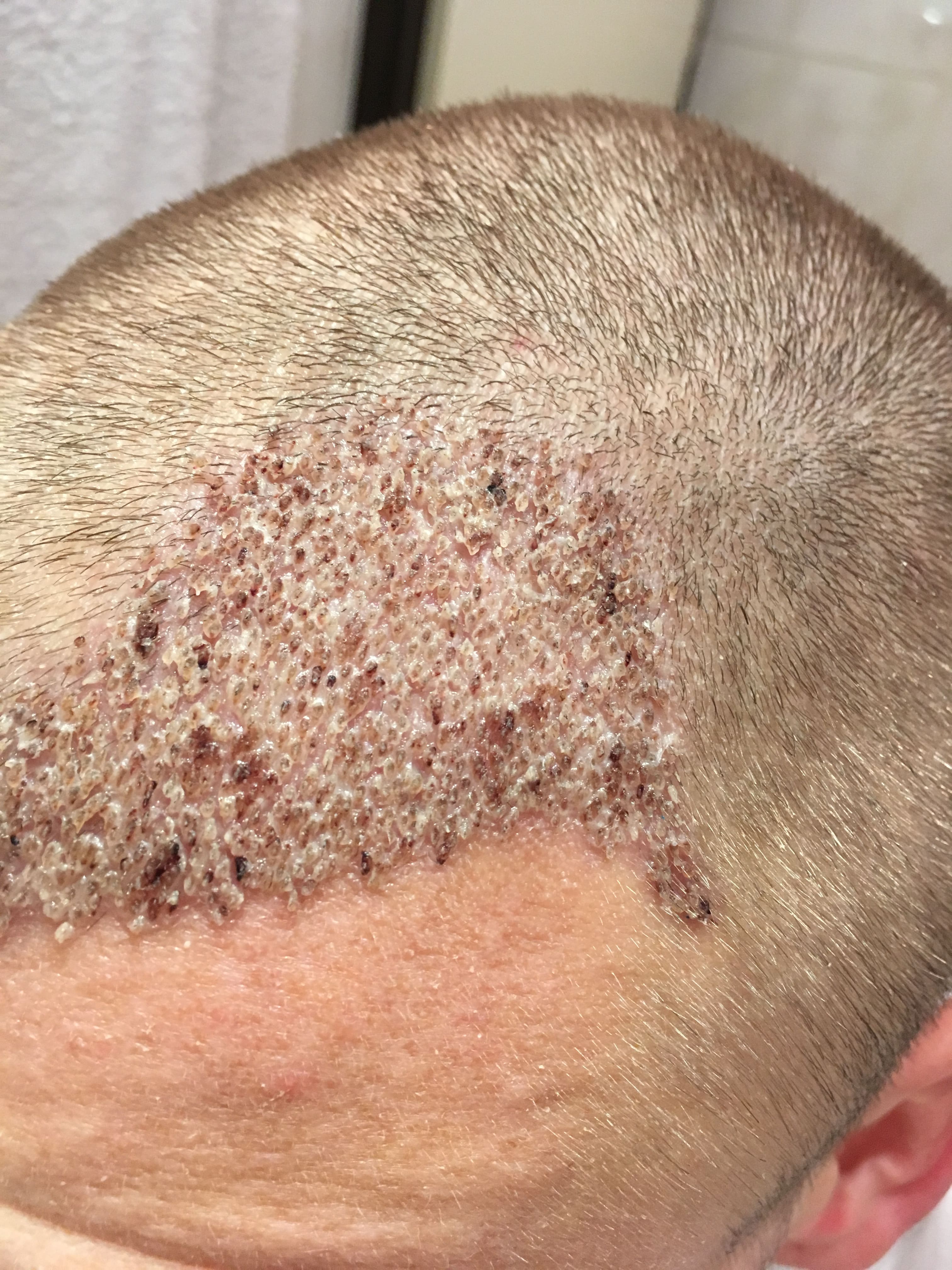 Seit Tag 4/5 post OP macht mir eine kleine Stelle auf der rechten Seite ein bisschen Sorge. Auf Anweisung von Dr. Demirsoy respektive Hr. Weber behandle ich die täglich mit Jod als Antiseptikum. Dr. Demirsoy meint, dass es nichts schlimmeres ist. Ich hegte schon die Befürchtung, dass es eine bakterielle Infektion sein könnte, ähnlich wie sei bei _Mario auftrat. Mit dem Auge im Spiegel sehr schwer zu erkennen, auf Fotos mit Blitz hätte man an einer Stelle Eiter interpretieren können. Auch die Dunkelrotfärbung der Stelle machte mich stutzig. Auch hier mache ich mir vermutlich wieder viel zu viel Sorgen. (Mann, langsam habe ich mehr Bilder von meiner Haartransplantation als von meiner Verlobten auf dem Handy )