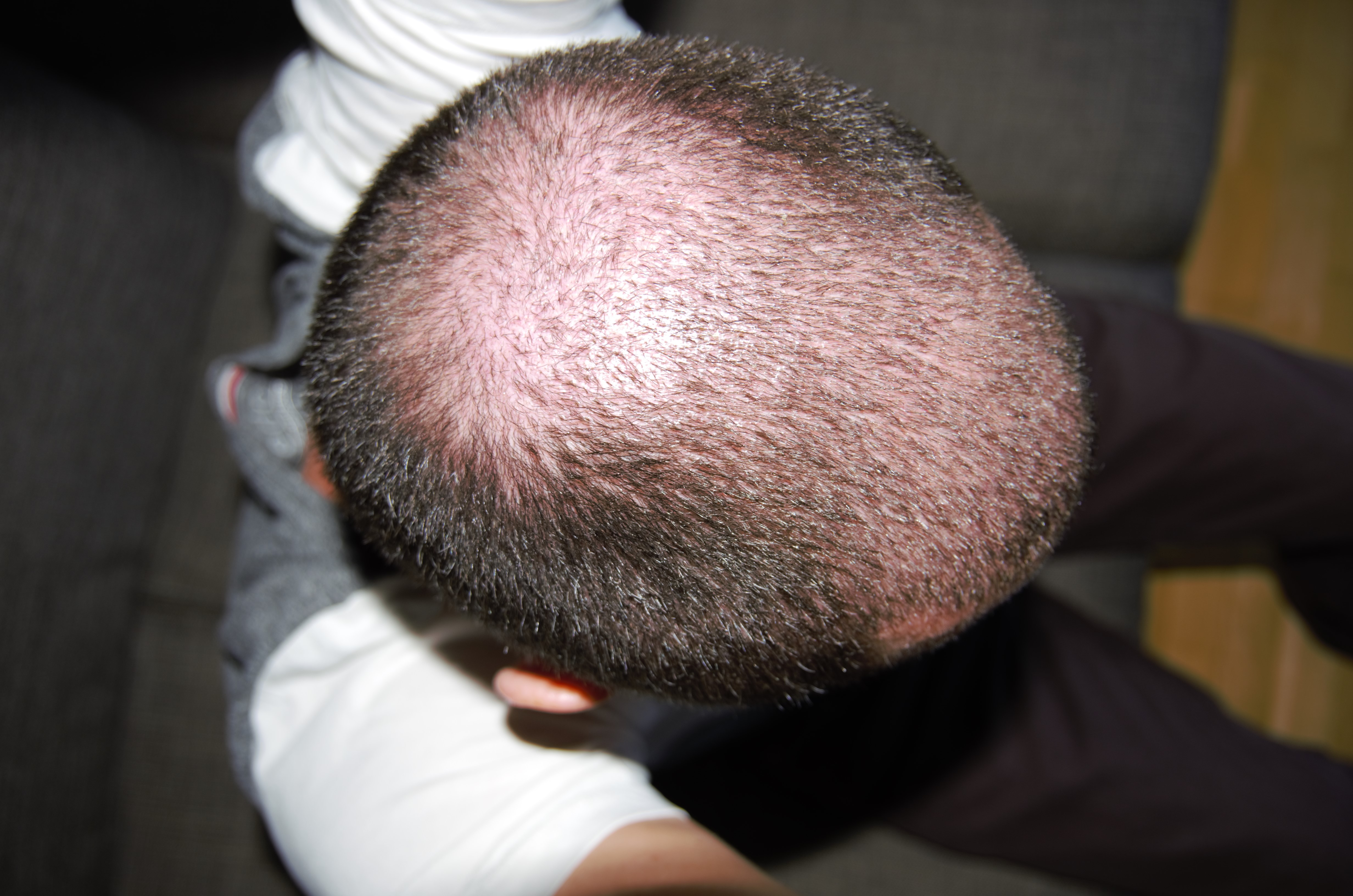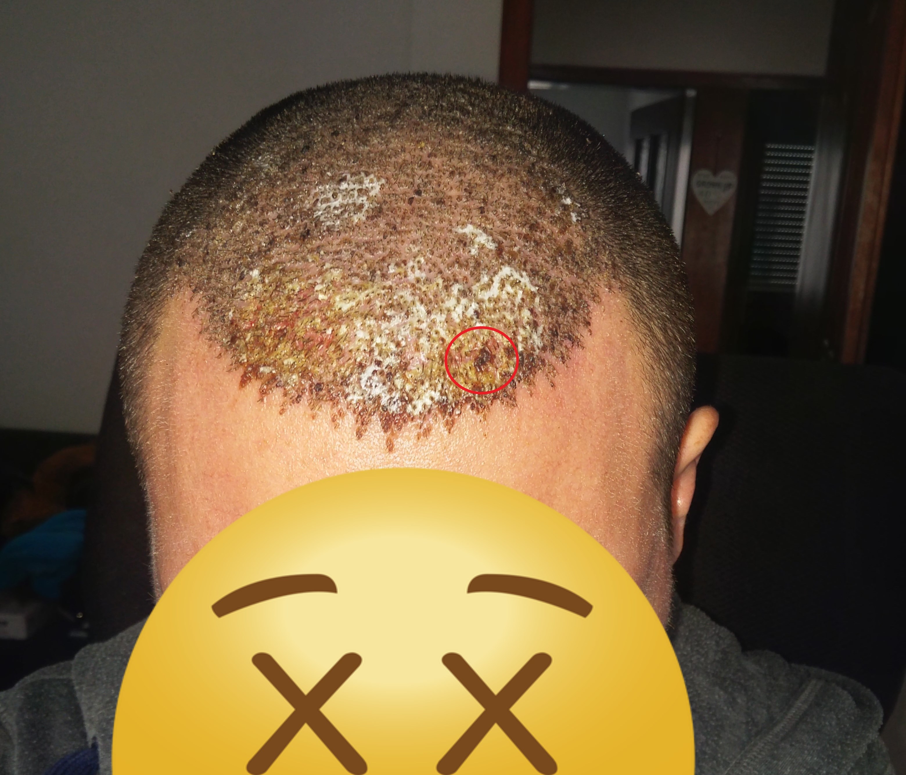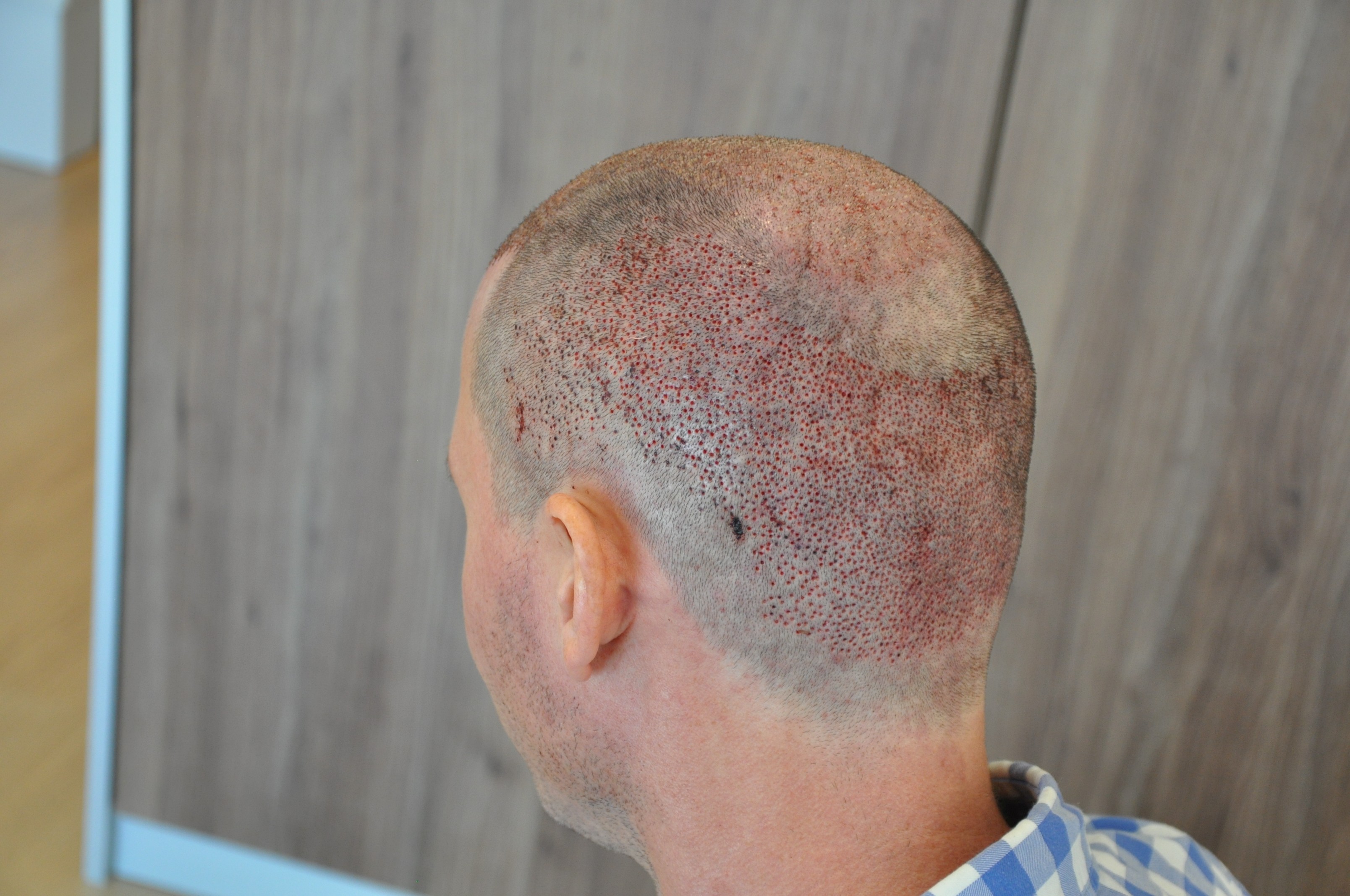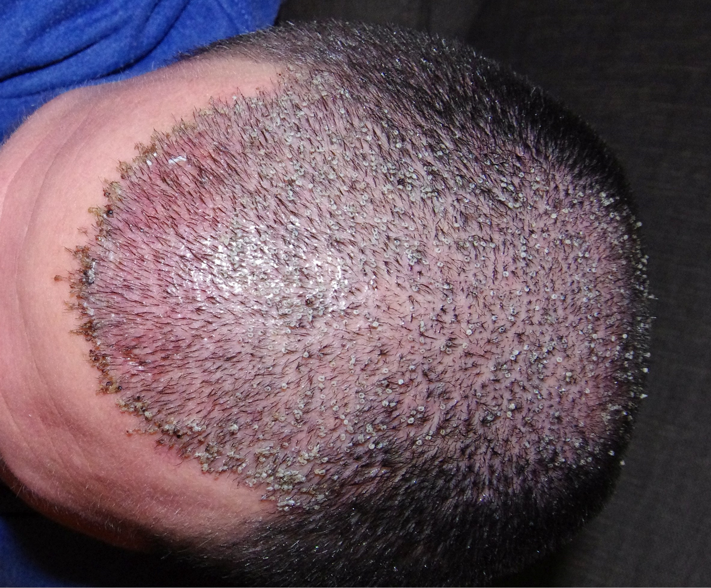 Nach Auftragen der Antibiotischen Salbe zersetzten sich die eitrigen Bereiche, welche sehr "matschig/breiig" wurden. Von der Konsistenz ähnlich einer faulen Banane. Ich selbst hatte recgt gut Angst, dass die Grafts in diesen Bereichen absterben, da sie mit Eiter umschlossen sind und keine Nahrung stattfinden kann. Den weiteren Verlauf wird hier jedoch die Zeit zeigen. Die meisten Sorgen hatte ich um das Abtragen der Creme, da diese von der Konsistenz wie Zahnpasta gemischt mit Vaseline sehr gut in den Haaren haftete. Mit Wasser auswaschen war vergebens, jedoch musste ich 2x Täglich den Bereich säubern und neu eincremen. Erfolg hatte ich mit Wattestäbchen mit denen ich sanft die Creme zwischen den Haaren abtrug. Bei dem Vorgehen hatte ich ein sehr unwohles Gefühl Smile Wie die Bilder Zeigen verheilt der Bereich weiterhin, zum Säubern benutze ich ab dem 8 Tage Post OP auch einen stärkeren Wasserstrahl. Der Arzt wollte täglich ein update sehen um die Heilung zu beurteilen.