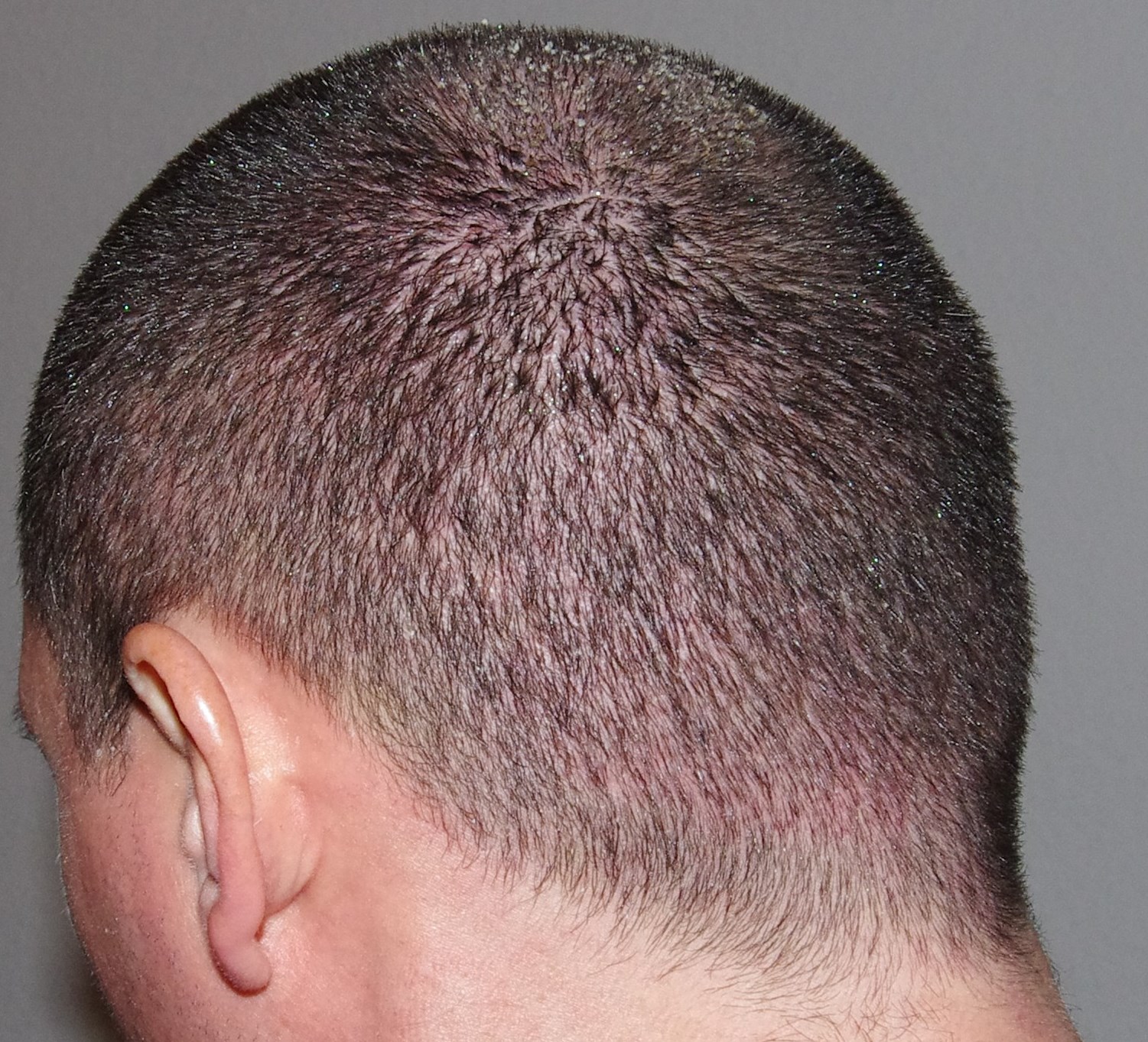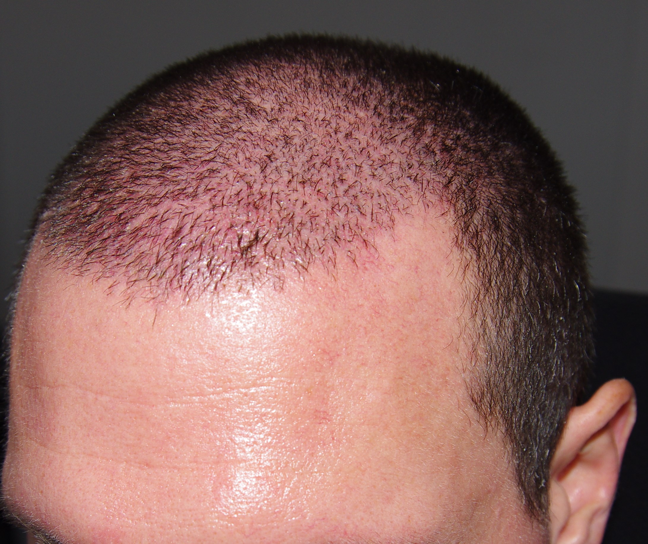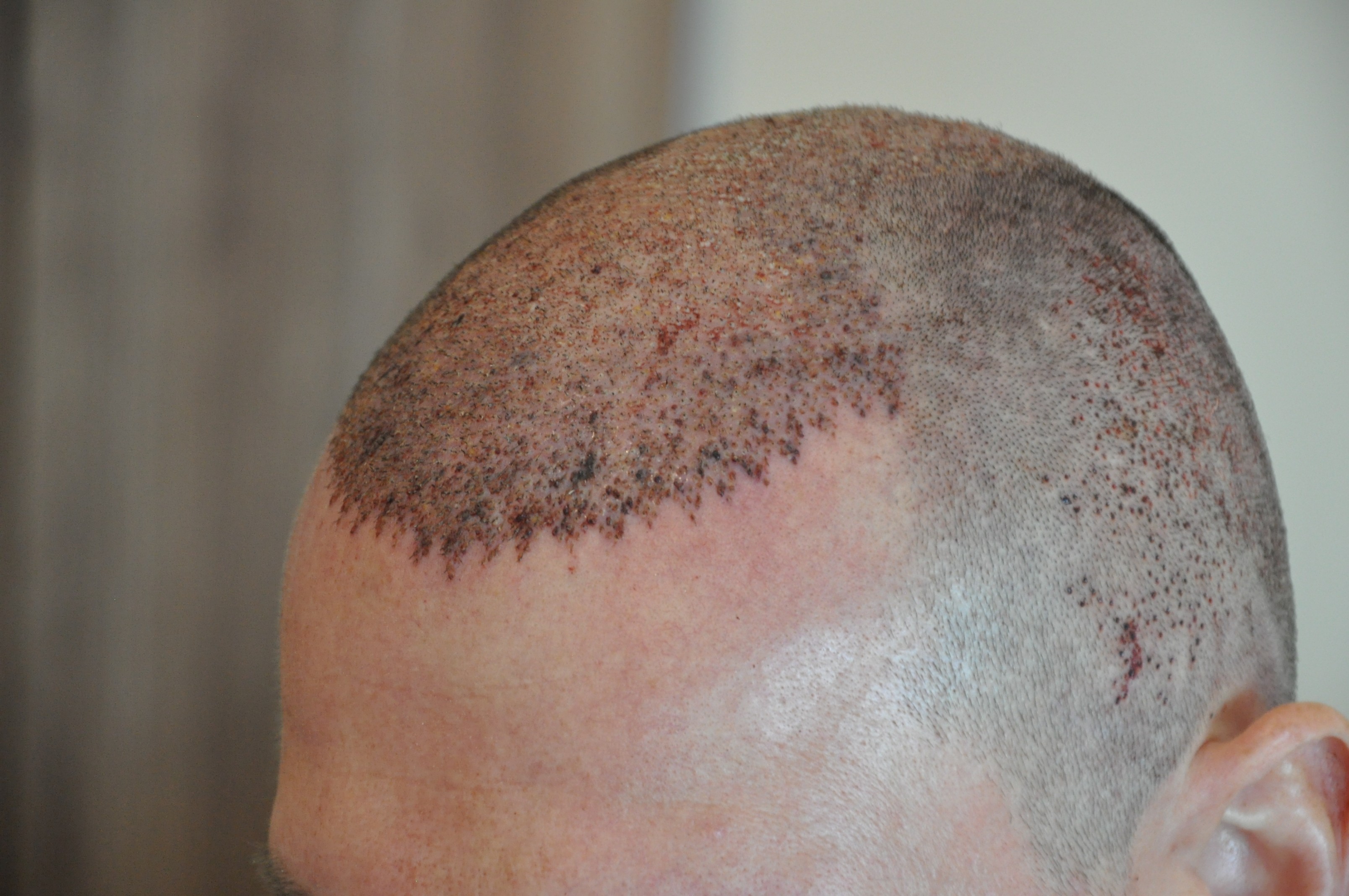 10 Tage nach der OP haben sich auf dem Transplantiertem Bereich die Krusten/Schorf gelöst und haften jedoch weiterhin an den eingesetzten Haaren. Vereinzelnt verliehr ich beim Waschen sogar Haare was zu erwarten ist.