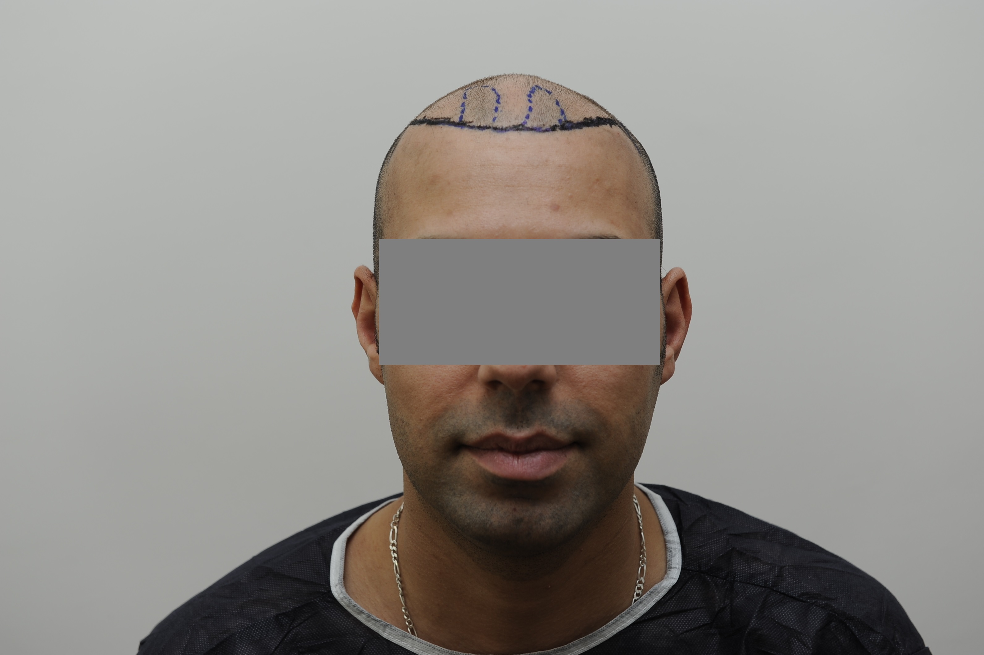 Nach Ankunft in der Klinik begutachtete Dr. Demirsoy meinen Haarstatus und stellte mir Fragen zu meinem Haarausfall. Da die kahle Fläche sehr groß war, entschieden wir uns für uns für eine konservative Haarlinie und die Transplantation des vorderen und mittleren Kopfes. Die Tonsur wurde ausgelassen und kann bei einer zweiten OP behandelt werden.