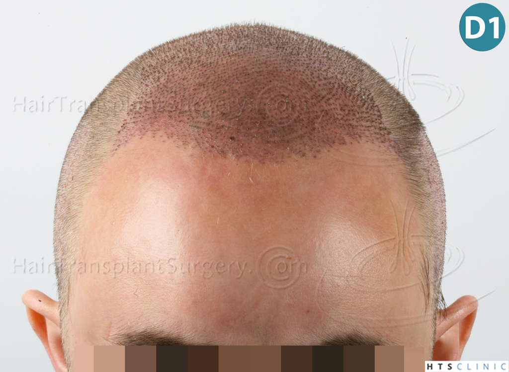 Mit den verwendeten Grafts konnte der Haaransatz des Patienten wieder aufgebaut und sein Stirn-, Mittel- und Scheitelbereich mit einer sehr zufriedenstellenden Dichte transplantiert werden. Dr. Devroye nutzte die Gelegenheit, um die Narbe von seiner vorherigen FUT zu reparieren.