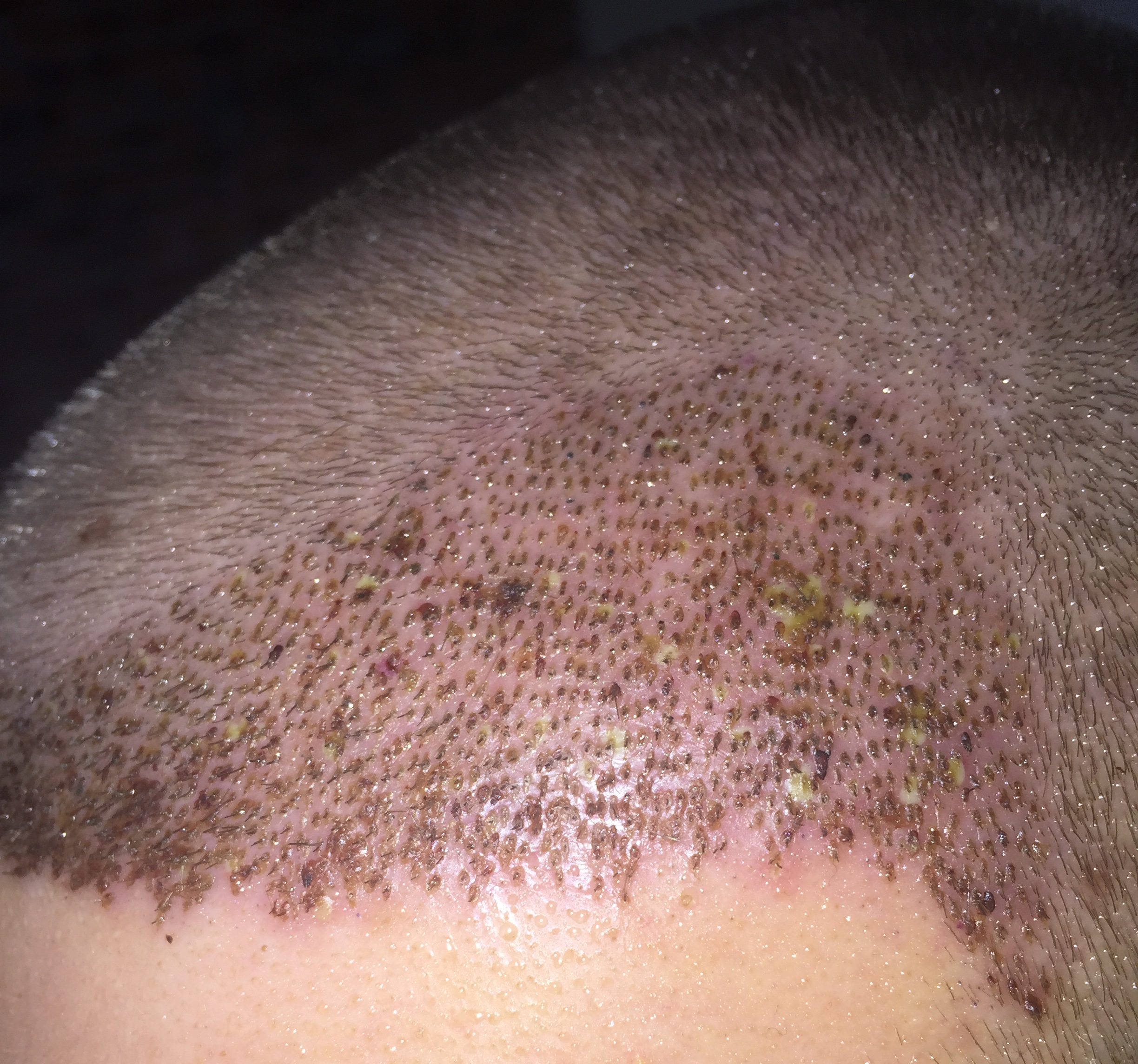 Ich hatte vor fünf Tagen meine HT ~2700 Grafts und nun sind gelbliche Flecken, die ein wenig wie Eiter aussehen im transplantierten Bereich aufgetaucht. Das Bild dazu habe ich angehangen...