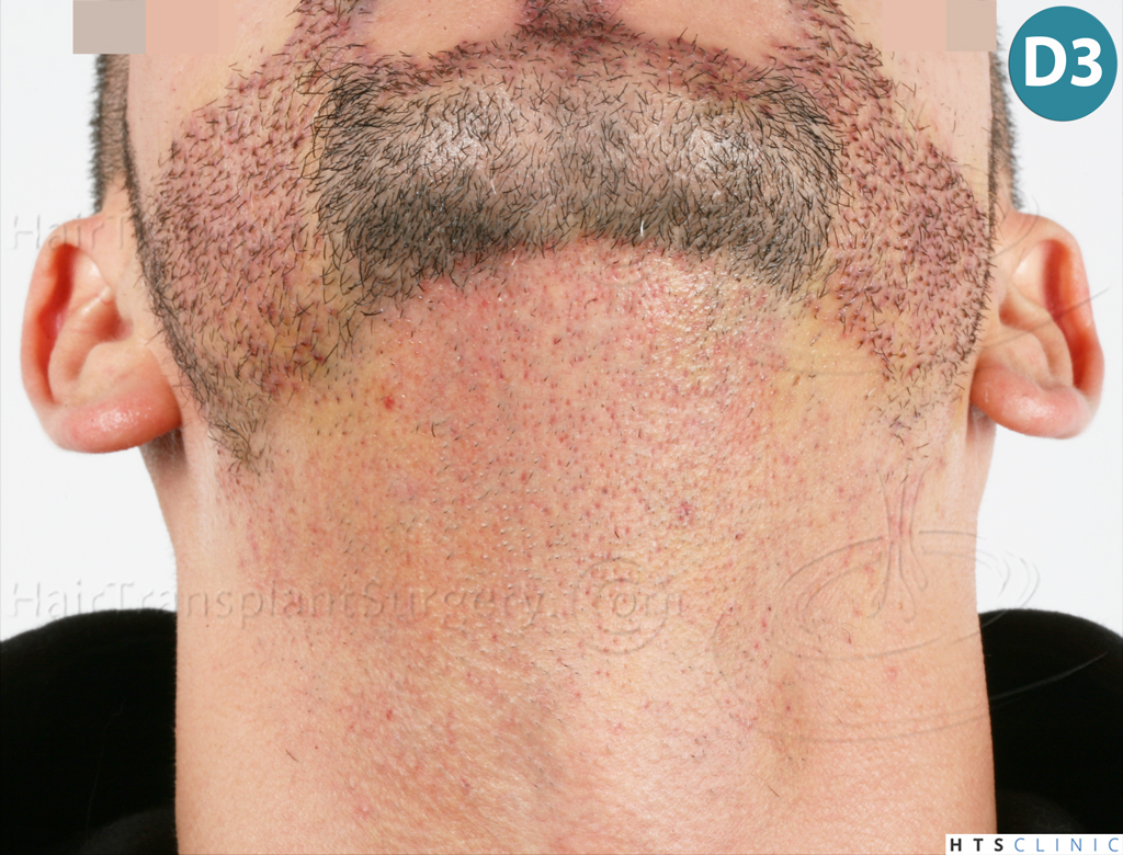 Seit jeher hatte der Patient nur wenige Barthaare, besonders in der Wangenregion. Dr Devroye hatte sich daher entschlossen, eine FUE durchzuführen, bei dem als Spenderbereich die Region unter dem Kinn und dem Nacken verwendet wird. Der Patient erhielt 1011 einzelne FUE-Grafts.