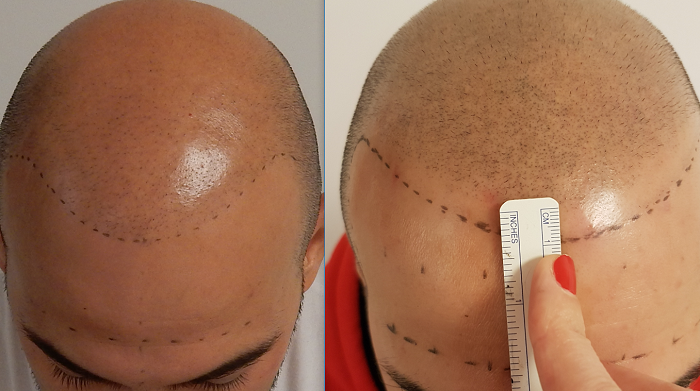 Auf der linken Seite das Bild mit nur Transplantaten, auf der rechten Seite ist es eine Mischung aus Transplantationen und Pigmentierung (Tricopigmentation)