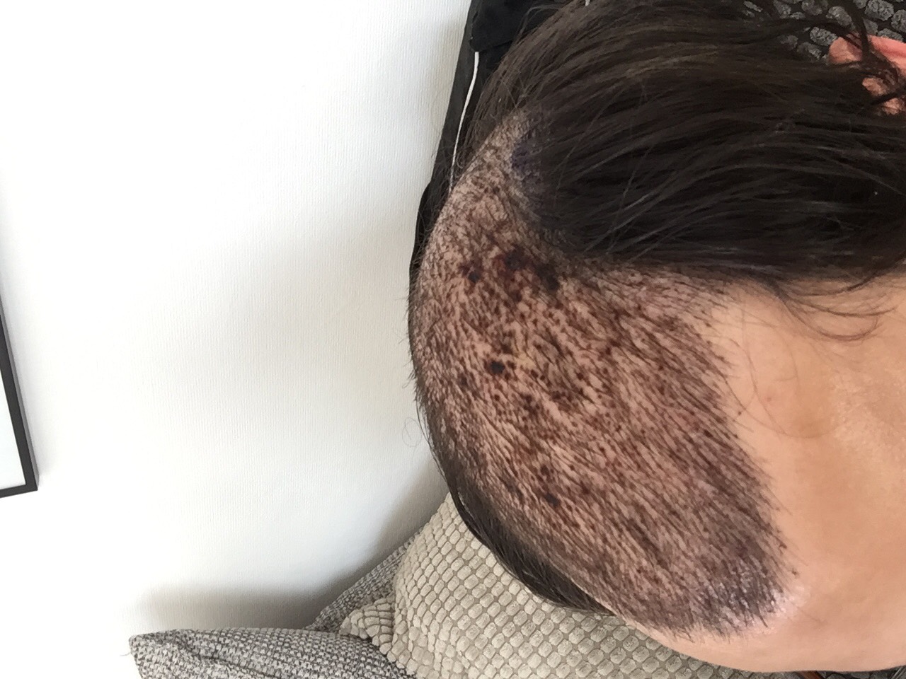 20 Tage Post OP... die Haare werden immer weniger. Narbe und der Empfängerbereich jucken derweil ziemlich stark, sind aber beide schon sehr schön verheilt. Seit ein paar Tagen habe ich auch hin und wieder ein paar Picken auf der Kopfhaut.