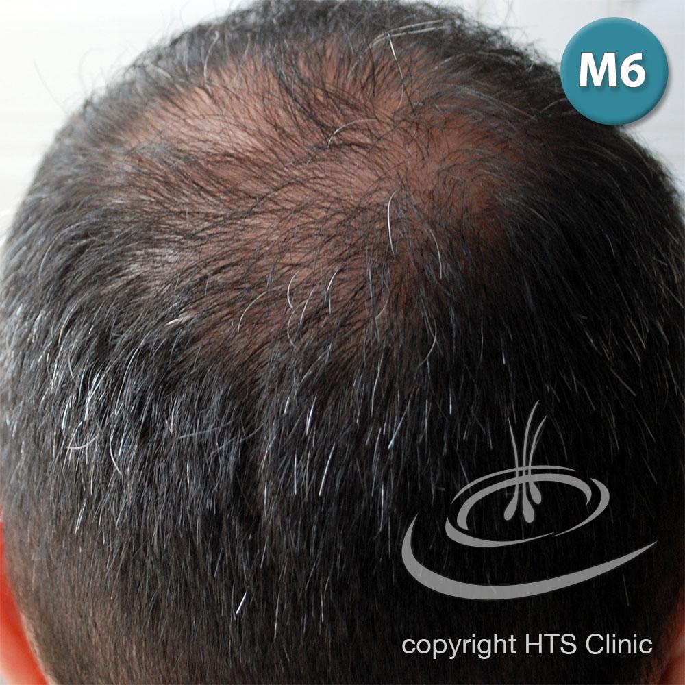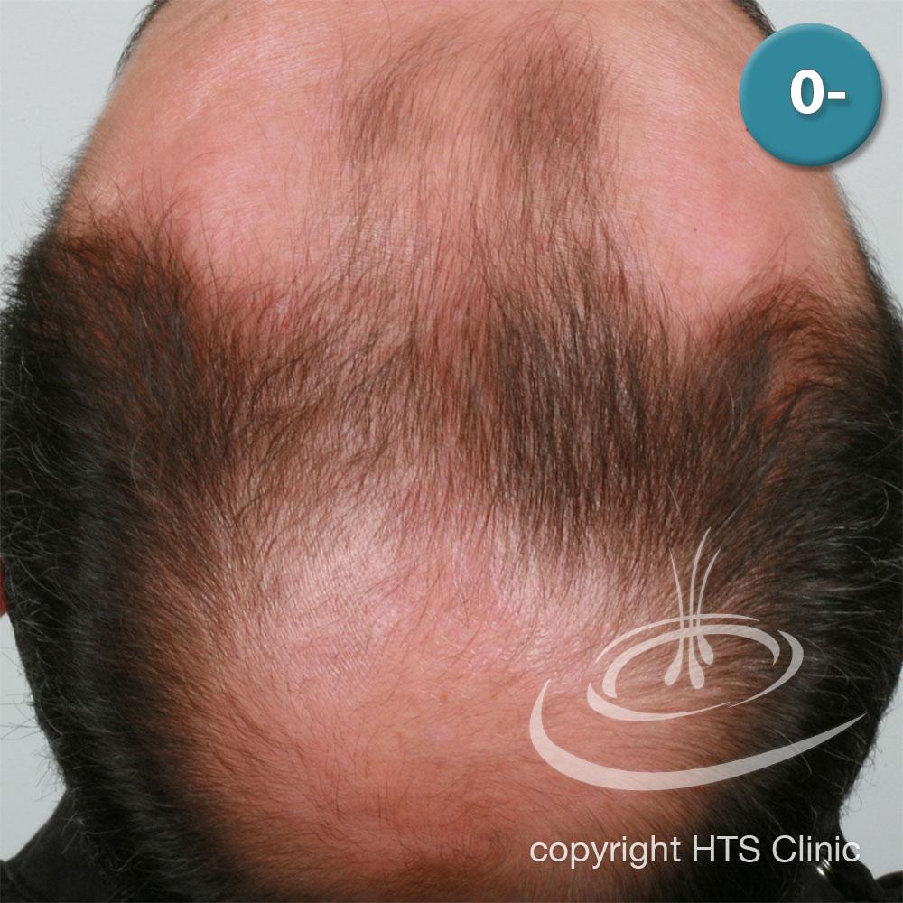 Der Patient ist NW6 und hat zudem einen schlechten Haut Haar Kontrast, um diese Fläche zu füllen sind mit leicht offener Tonsur je nach Patient 5000 bis 6000 Grafts notwendig. In diesem Fall trägt der Patient seine Haare sehr kurz was suboptimal ist, außerdem sind Blitzlicht Fotos erschwert zu Bewerten.