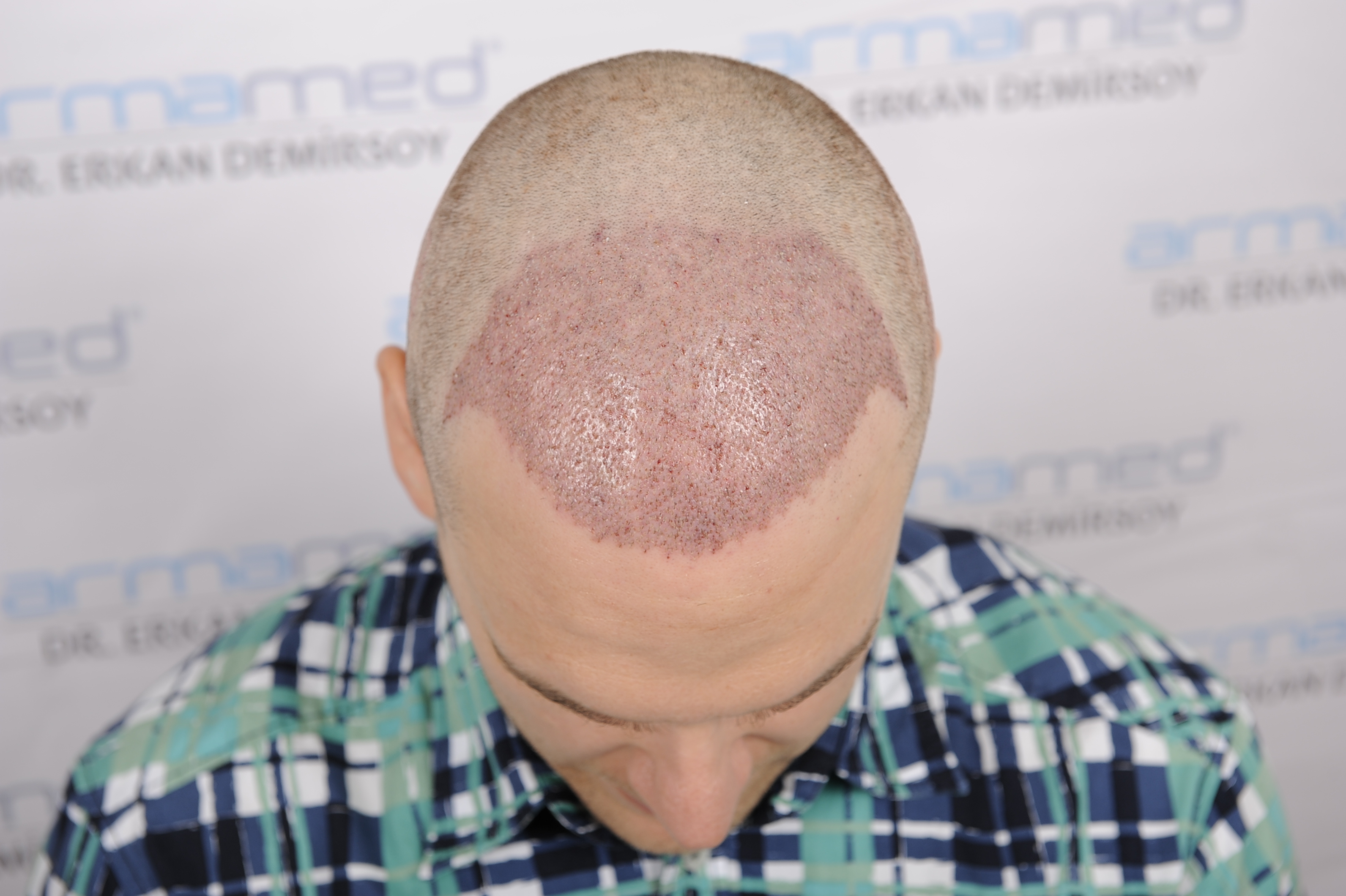 Es ist die Frage, ob die Haare an den Stellen noch wachsen werden oder wurden diese an den Stellen gar nicht verpflanzt. Eigentlich sollte die Dichte von mindestens 50 Grafts pro 1cm2 locker erreicht sein bei 3010 Grafts, die entnommen wurden. Da sollten damit 60 cm2 bedeckt sein. Wenn wir noch annehmen, dass 95% aller Grafts überleben, sollen es immer noch 2860 Grafts sein und die Dichte bei 47,7 Grafts pro 1 cm2 liegen.