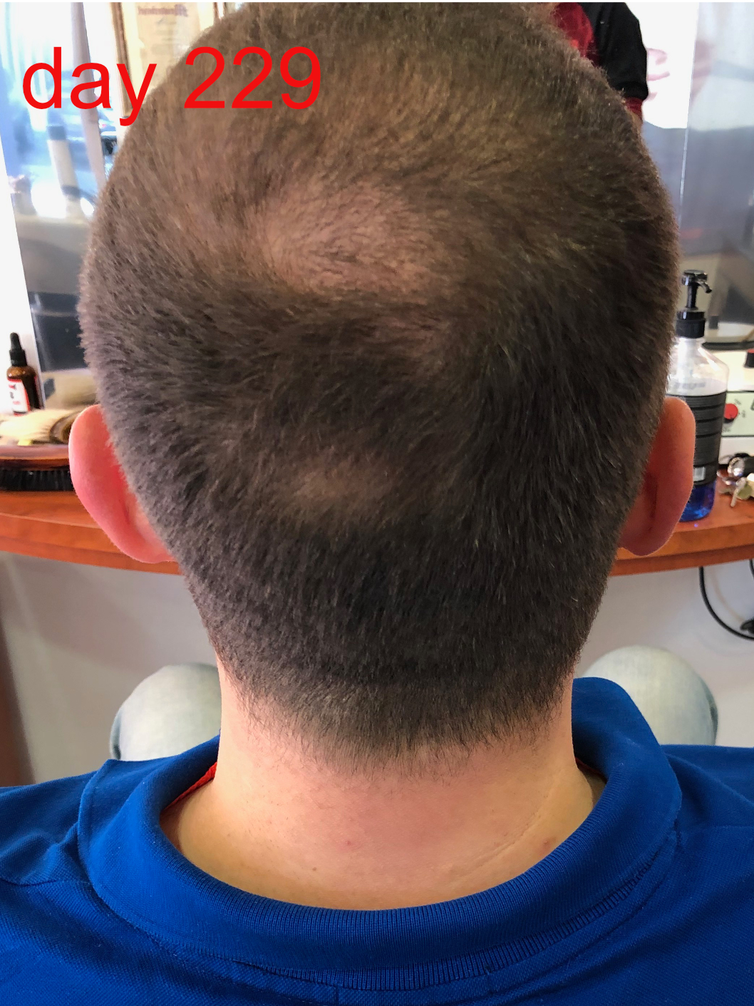 Tag 229 - 7,5 Monate nach der OP. Das Haar ist noch einmal ordentlich dicker geworden und ich bin sehr glücklich mit dem aktuellen Status. Hinten ist sicher noch Potential und ich hoffe auf weitere Verbesserung in den nächsten Monaten. Aber auch so bin ich jetzt schon extrem glücklich den Schritt gemacht zu haben...