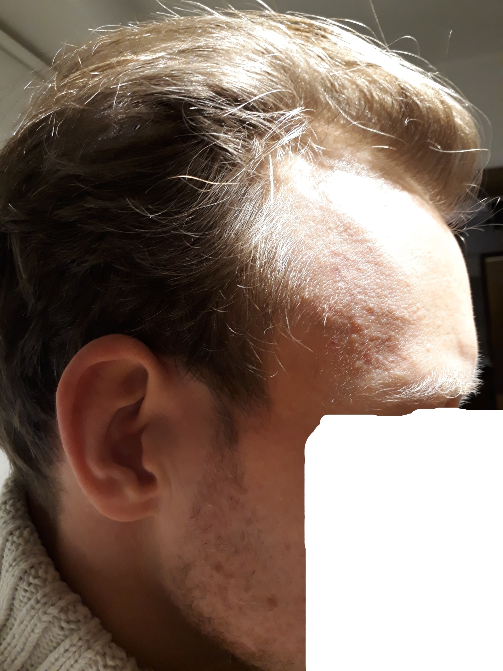 Männlich, erblich bedingter Haarausfall, der mit ca. 28 Jahren begonnen hat. Anhand der Bilder meines Großvaters kann ich schon abschätzen, dass diese Wutlocke vorne ungefähr in der aktuellen Dichte bestehen bleiben wird. Die angehängten Fotos zeigen die Situation und den Donor. Ich liefere gerne noch Fotos nach.