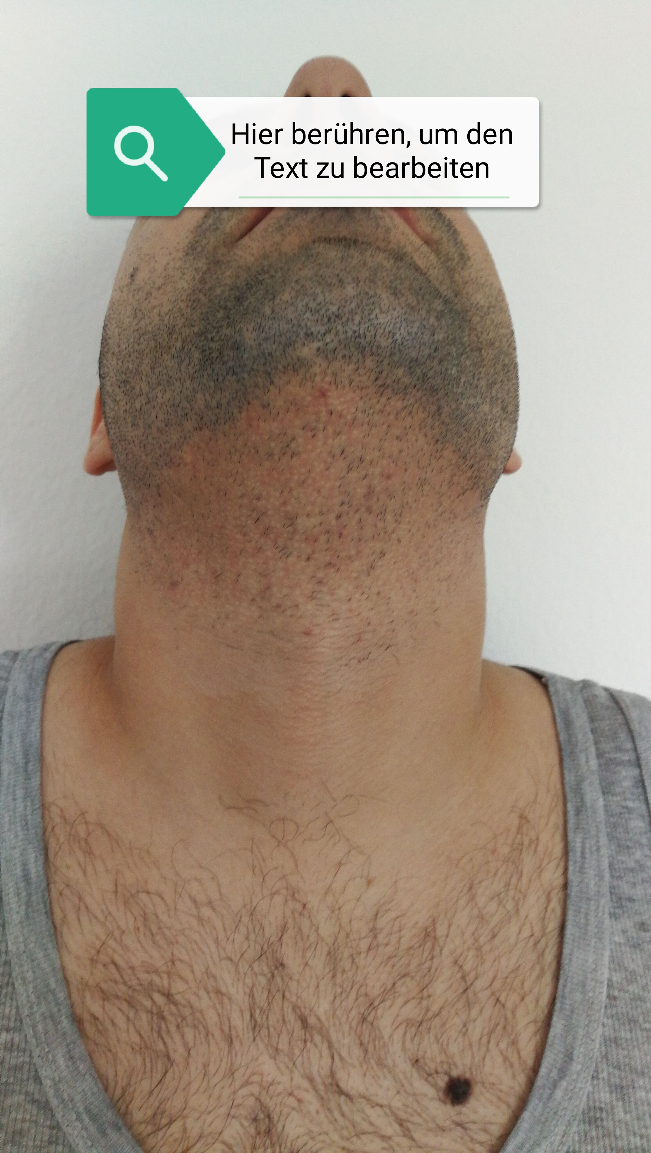 Sieht man nichts insbesondere wenn ich den Kopf normal halte, was man erkenne kann sind kleine Punkte aber fallen direkt auf, und auch wenn man sich nicht langr Zeit sich nicht rasiert fängt man an etwas zu sehen. Da ich mich jeden 3 Tag Rasiere sieht man nicht und wurde bis jetzt auch von niemanden angesprochen.