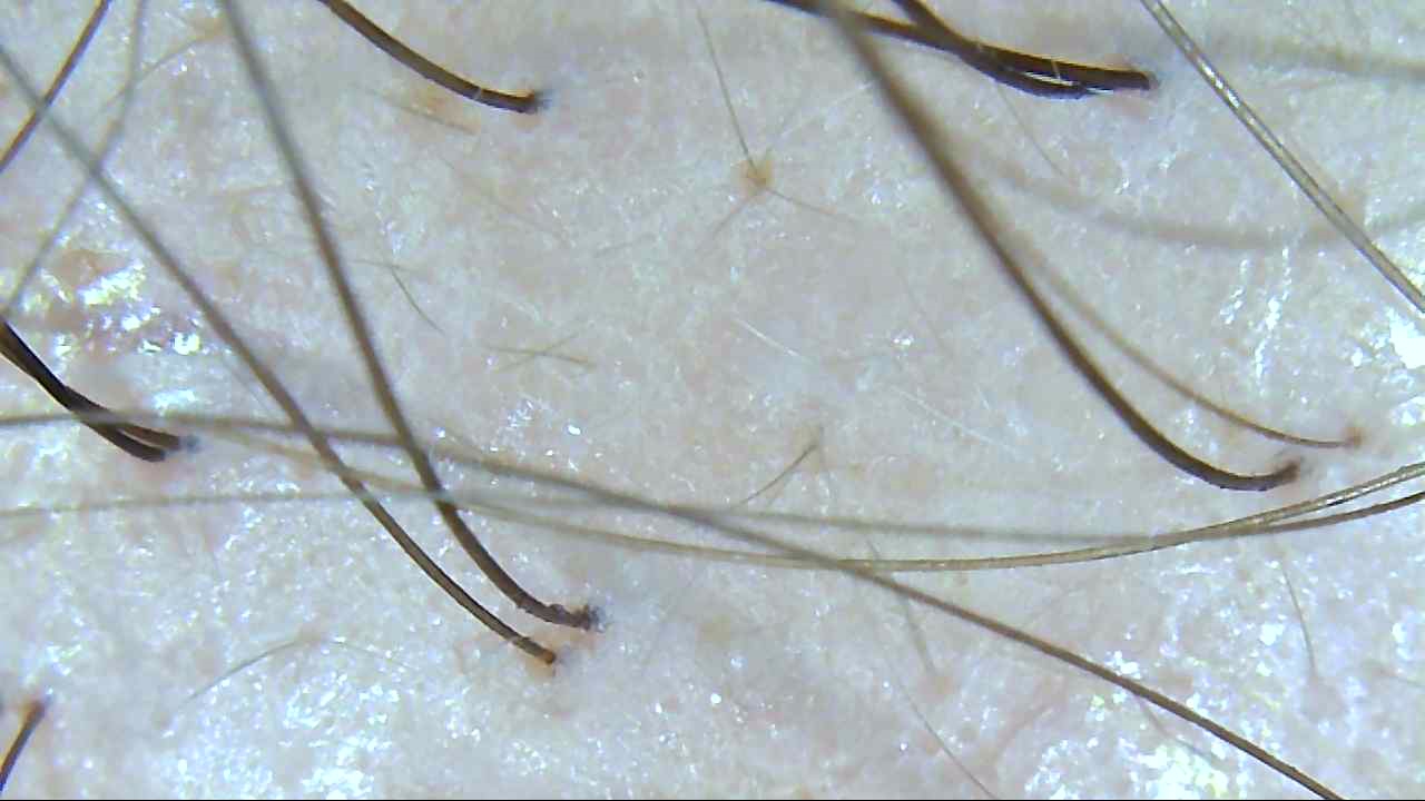 Ich habe mir mit meinem USB-Mikroskop auch den transplantierten Bereich angesehen (siehe Fotos). Man erkennt, dass die transplantierten Haare nicht gänzlich ausgefallen, aber sehr stark miniaturisiert sind.