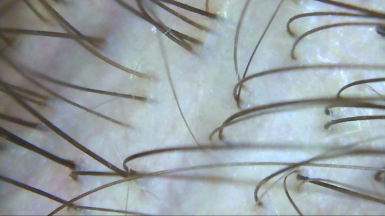 Ich habe mir mit meinem USB-Mikroskop auch den transplantierten Bereich angesehen (siehe Fotos). Man erkennt, dass die transplantierten Haare nicht gänzlich ausgefallen, aber sehr stark miniaturisiert sind.