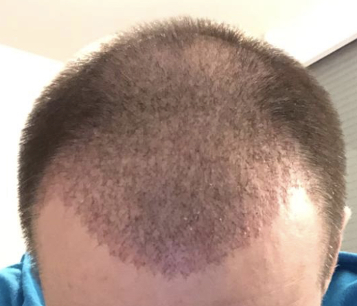 Mittlerweile sieht der Empfängerbereich wirklich schlimm aus. Einige Stellen sind ausgefallen, andere transplantierte Haare sind im Wachstum stagniert und dann gibt es wieder Althaare, die jetzt mittlerweile 1 cm lang sind.