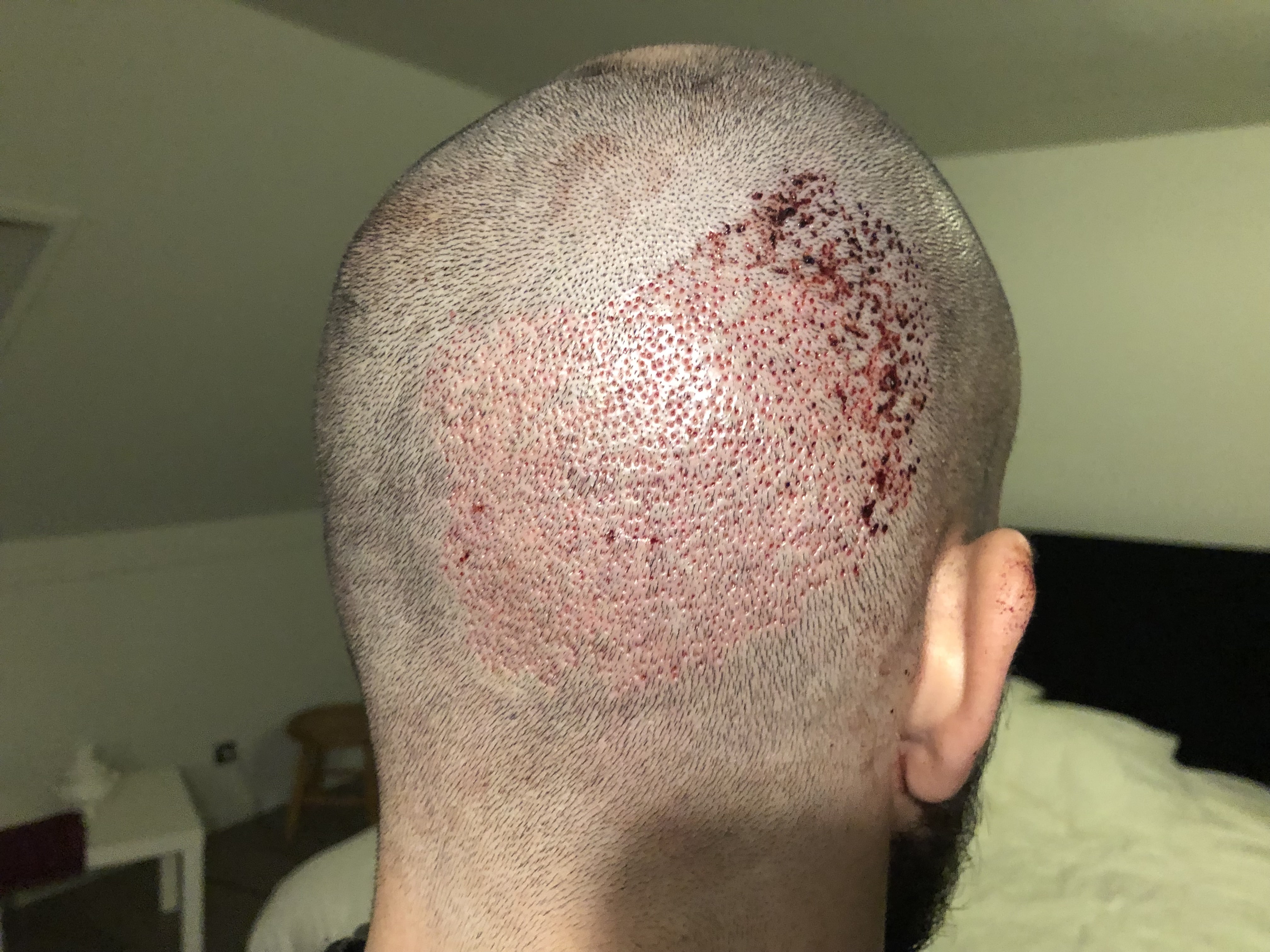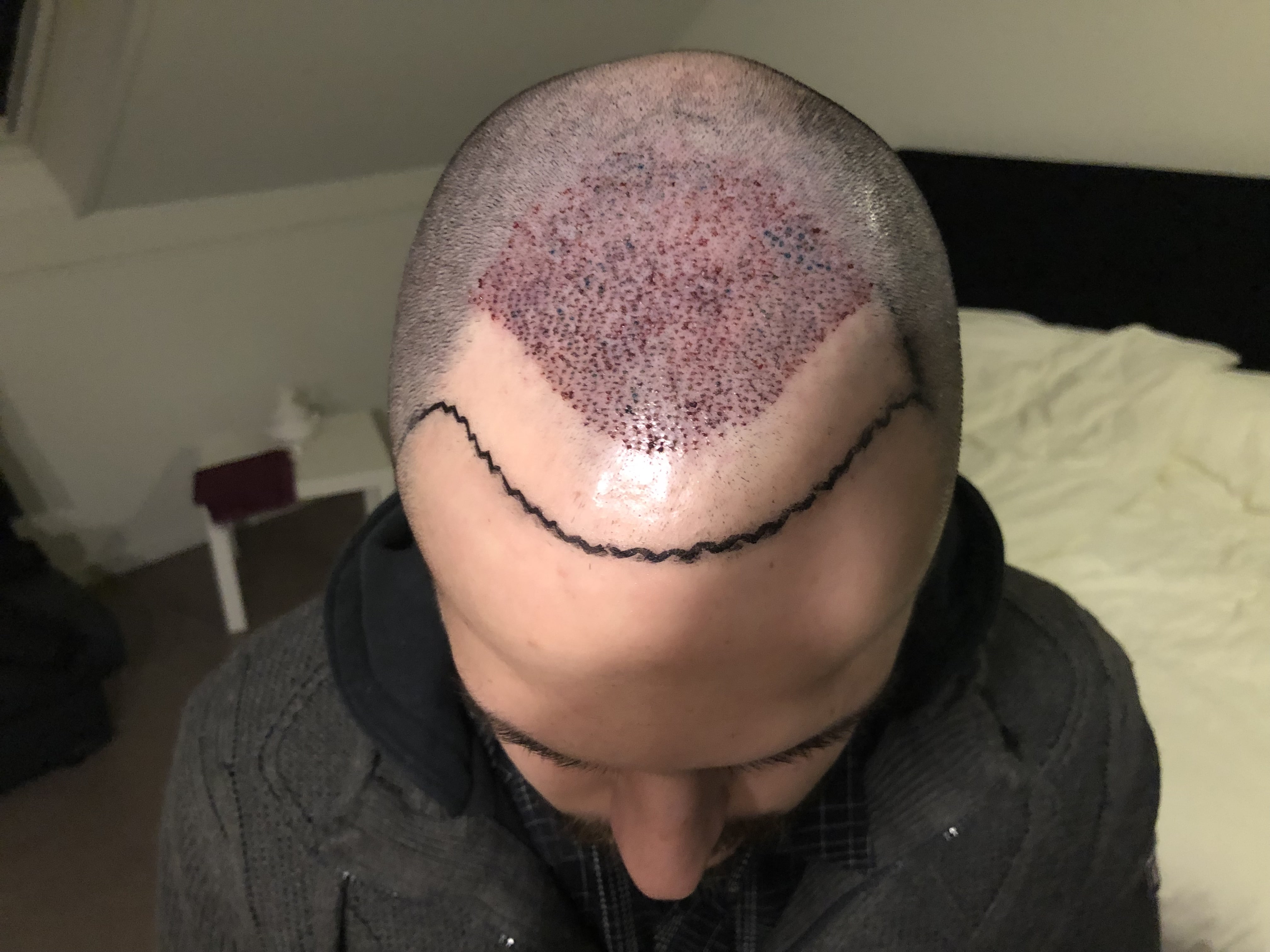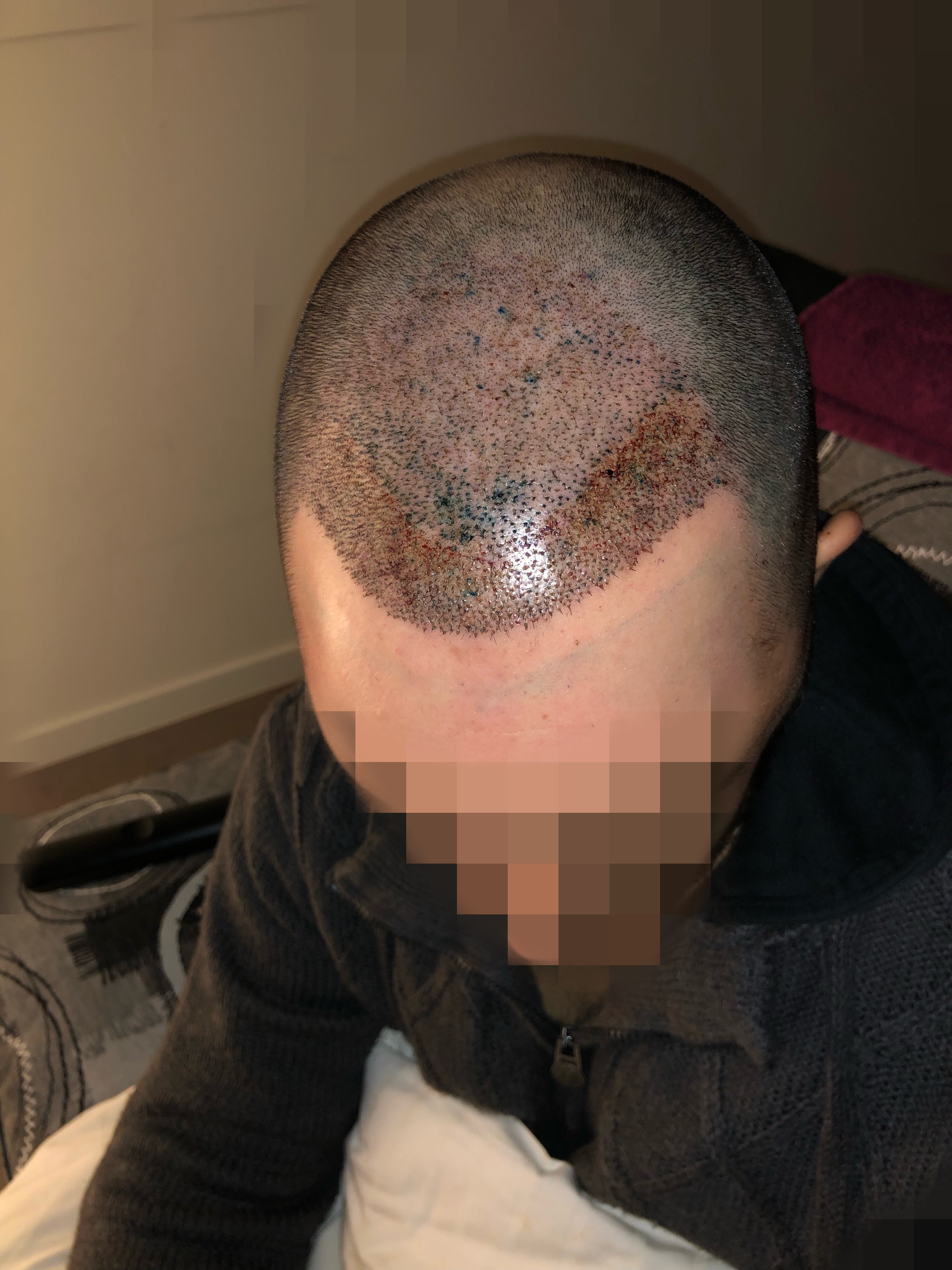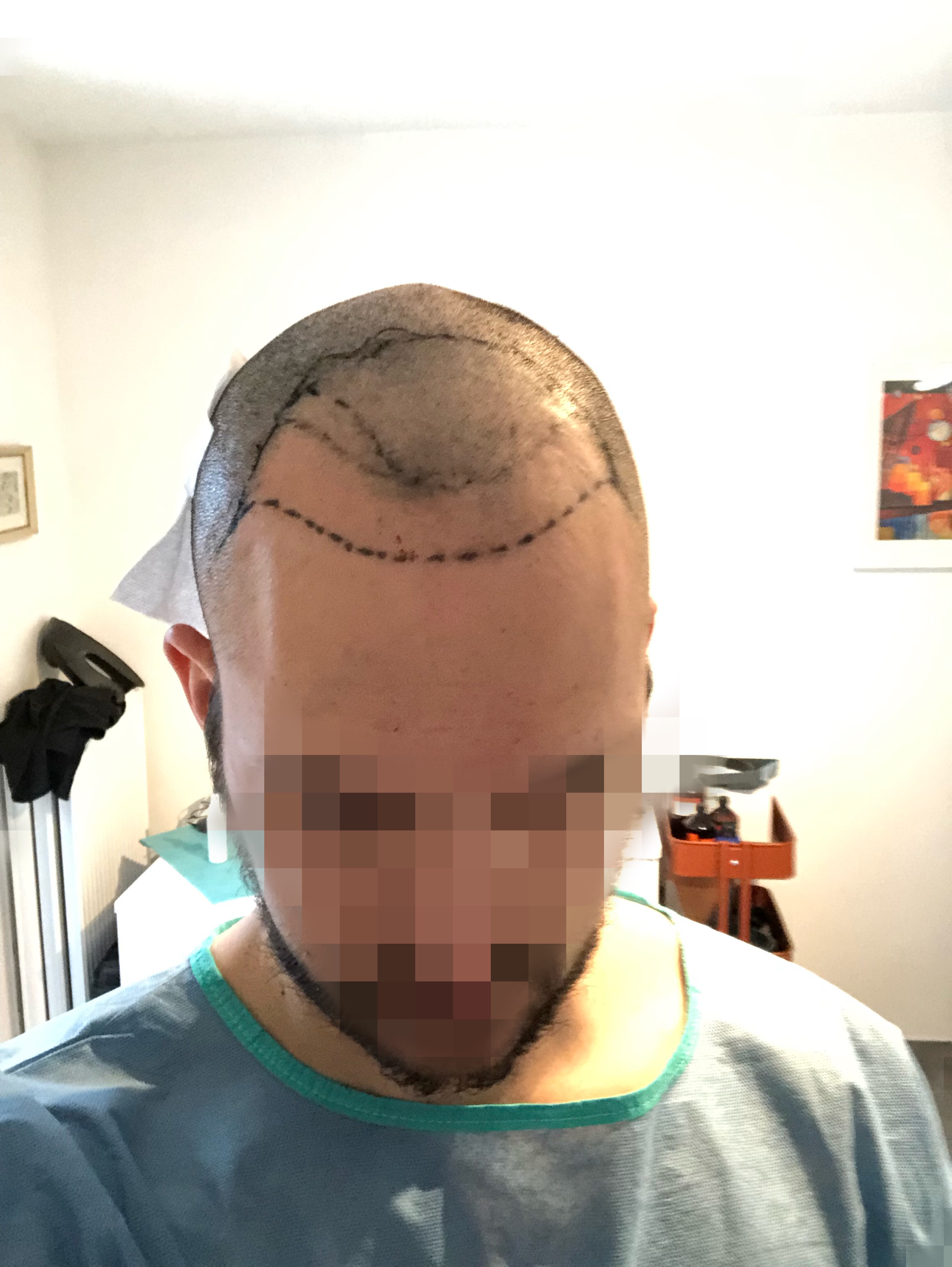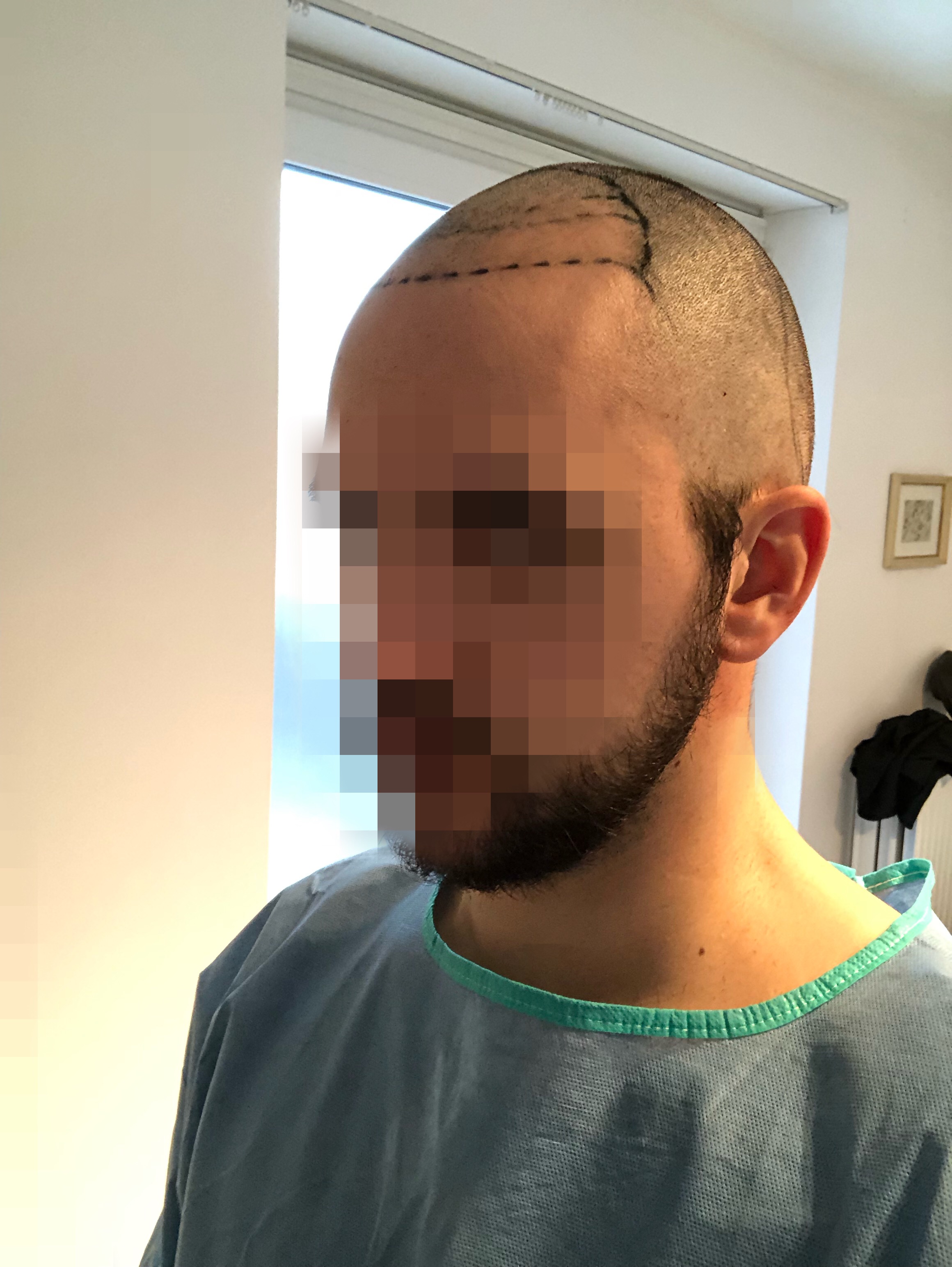 Zuerst wurde mir eine Beruhigungstablette gegeben und dann der rechte Hinterkopf betäubt. Kein angenehmes Gefühl, aber auszuhalten. Alles danach wurde nicht gespürt und man konnte etwas wegdösen, wenn man müde ist. Nach 3 Stunden gab es eine kurze Mittagspause, in der man mit Nahrung und Getränken versorgt wurde. Dann ging es mit der Betäubung im Vorderkopf los. Für mich unangenehmer als im Hinterkopf. Es wurden einige kleine Löcher in die Haut geschnitten und daraufhin wurden die Grafts eingesetzt. Der Vorgang wiederholte sich einige Male, bis zu einer der gezeichneten Markierungen und dauerte insgesamt ca. 5 Stunden. Abgeschlossen war die OP also um 17 Uhr.