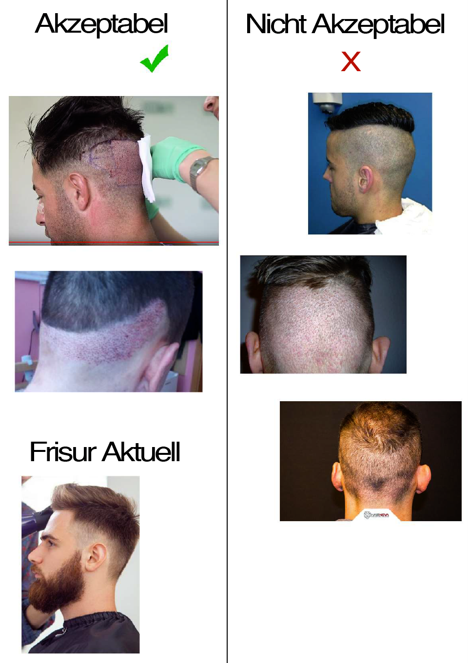 Ich arbeite im öffentlichen Leben und in meinem Job ist es sehr wichtig gut auszusehen, mein Arzt hat mir gesagt, dass die Haare nicht abrasiert werden müssen, also oben am Deckhaar, am Spenderbereich werden diese rasiert, ich trage meine Haare an den Seiten eh kurz 1mm, wenn ich frisch vom Frisör komme.