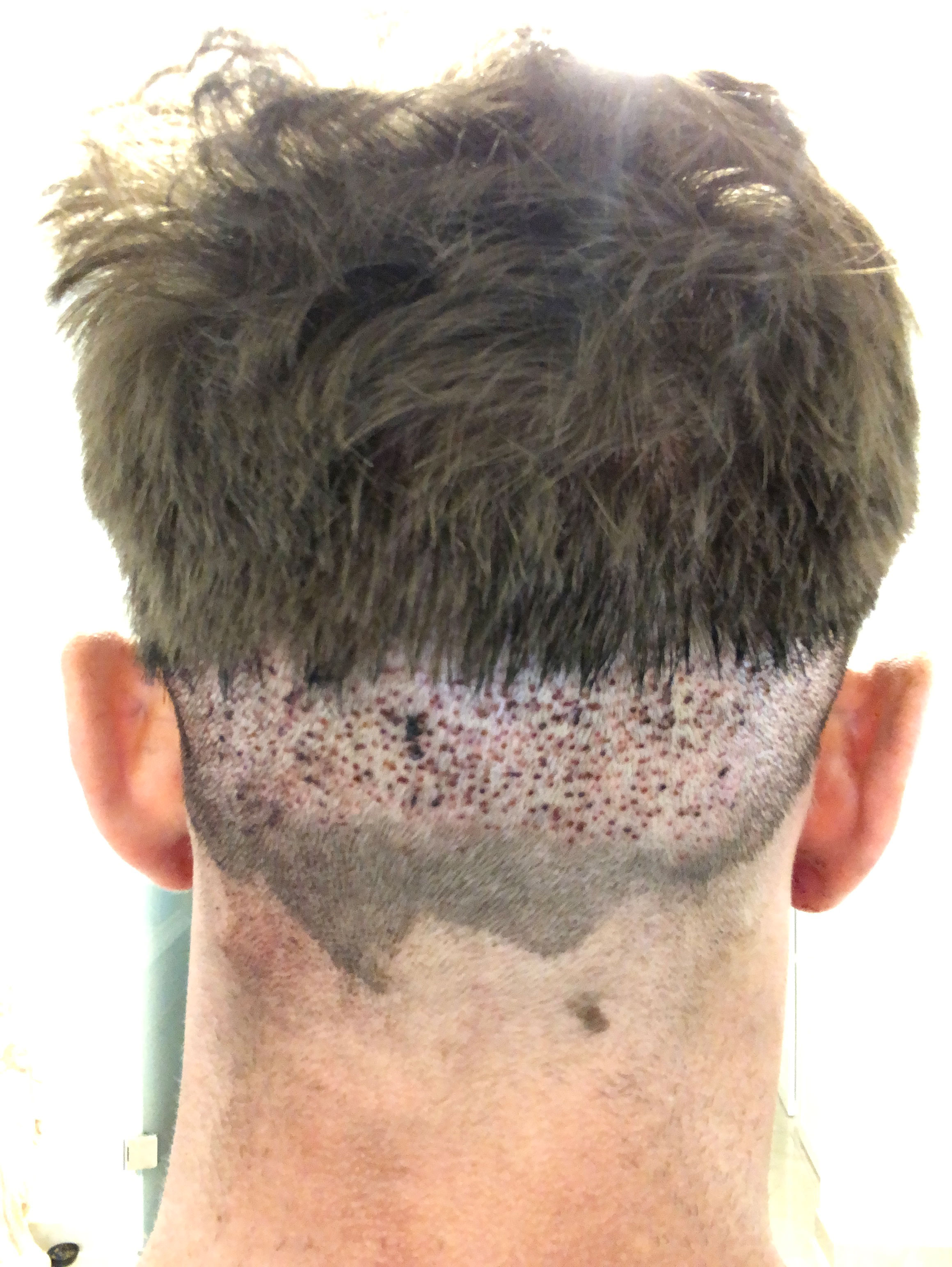 Das dachte ich mir schon. Die Entnahme wurde viel zu konzentriert aus einem Bereich entnommen. Das machen grundsätzlich Anbieter die wenig Ahnung haben. Da dir aber maximal 1000 Grafts verpflanzt wurden wirst du wahrscheinlich ohne Narbe davon kommen