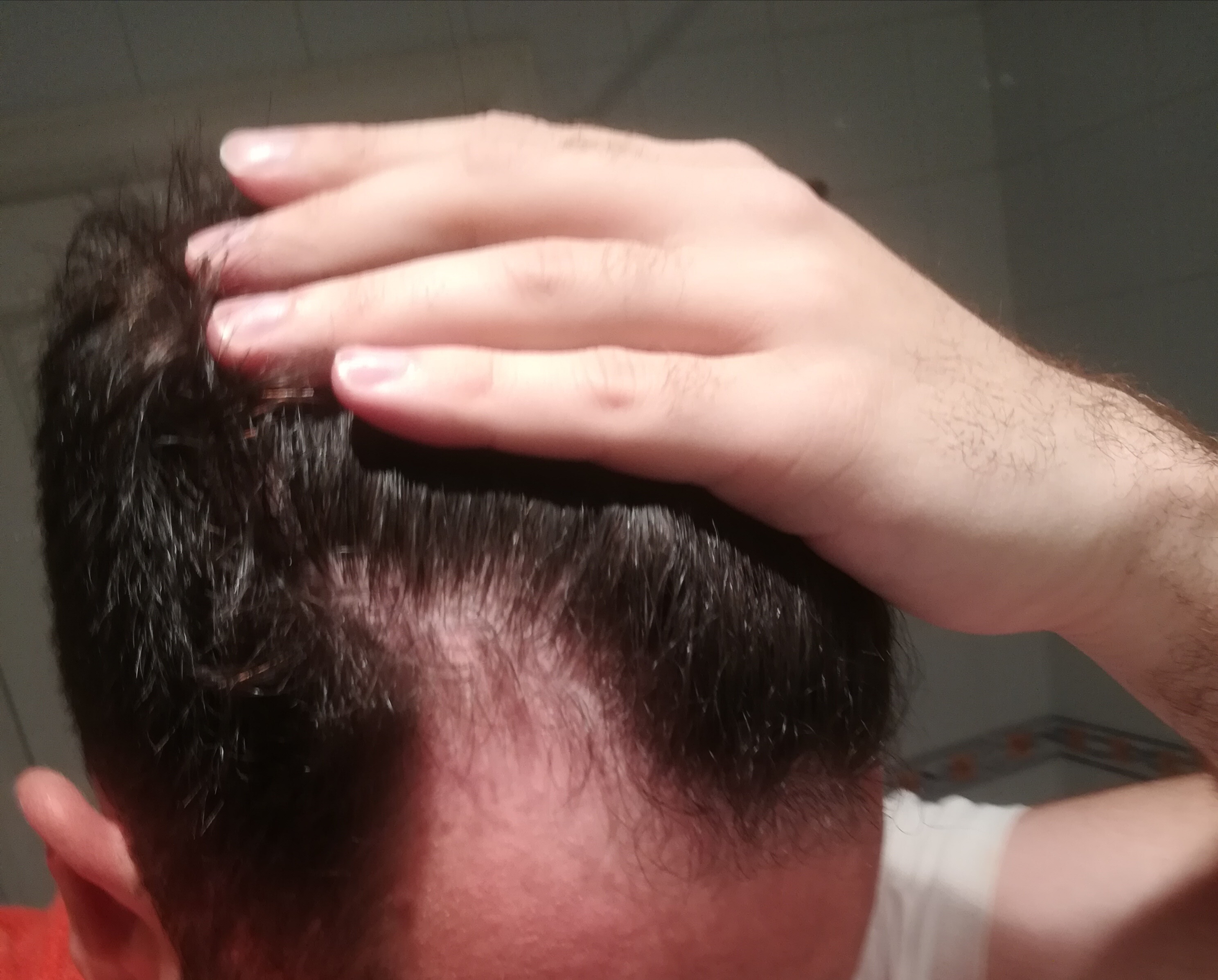 Was ich mir von der HT erhoffe: Ich möchte nicht von heute auf morgen wieder perfekte Haare, sondern einfach einen Status mit dem ich zufrieden bin. Ein Haarstatus mit dem ich voll zufrieden wäre, wäre Geheimratsecken wie jetzt + hinten dicht. Generell ist mir vorne also nicht so wichtig, sondern eher der hintere Bereich. Das kann sich natürlich ändern, wenn es vorne schlimmer werden sollte. Es kommt mir aber so vor, als wäre vorne das Schlimmste vorerst überstanden und nun ist halt der hintere Bereich die neue Problemzone. Momentan würde ich den Status zwar als nervig, aber noch zu früh für eine HT beschreiben (siehe Fotos).