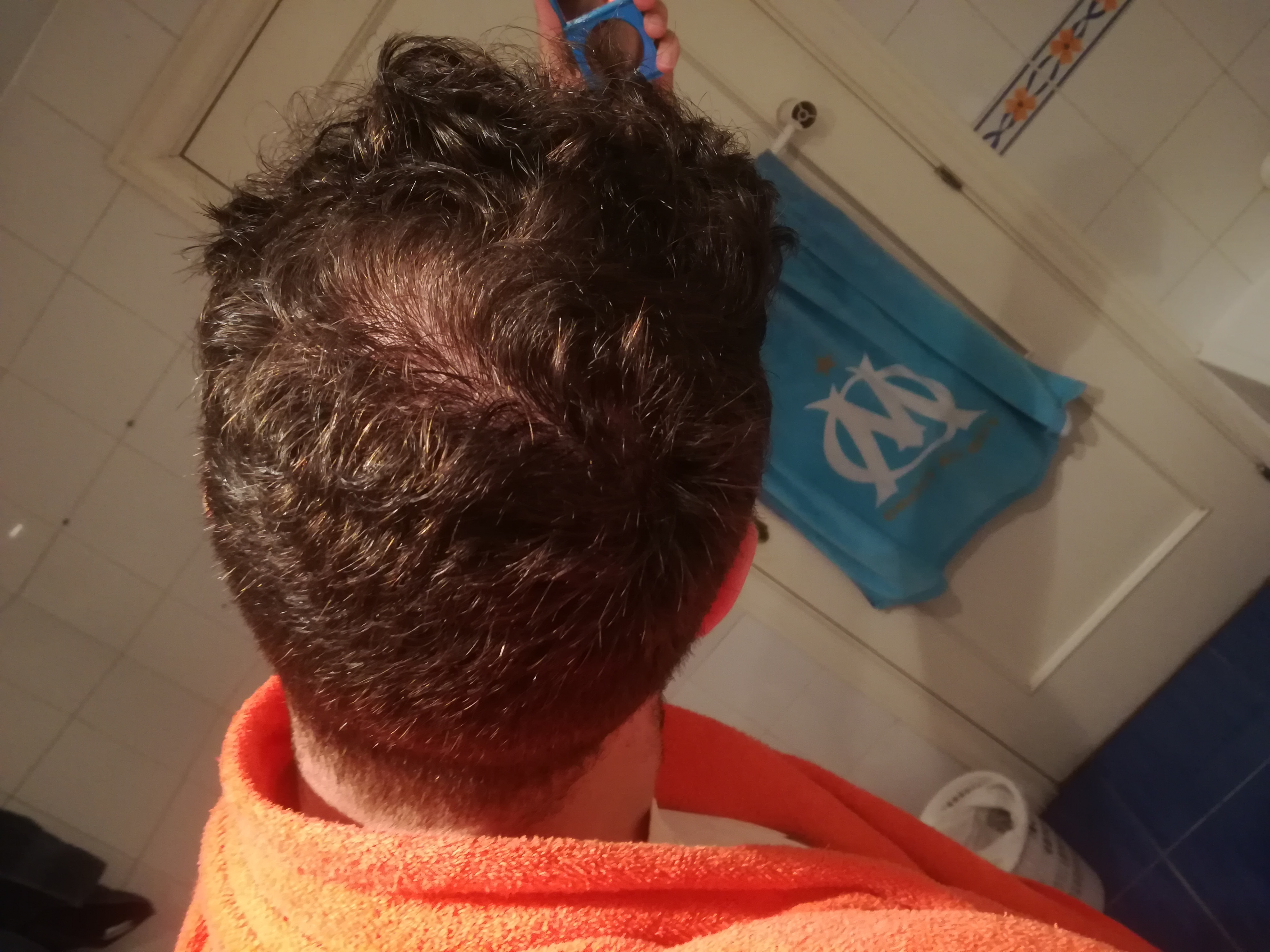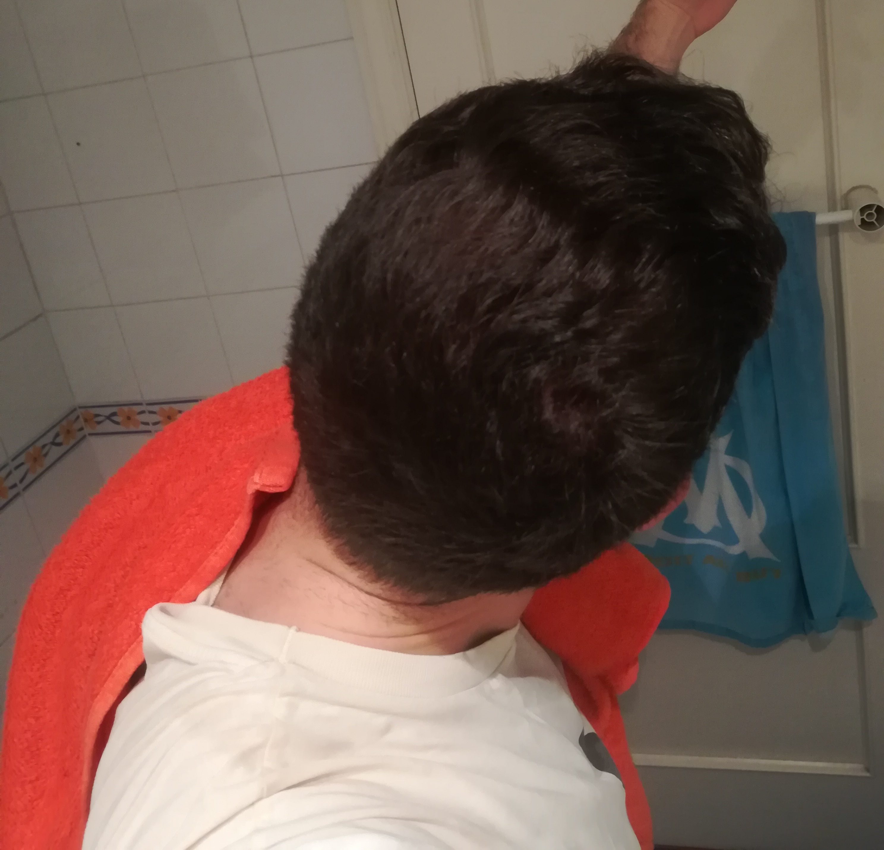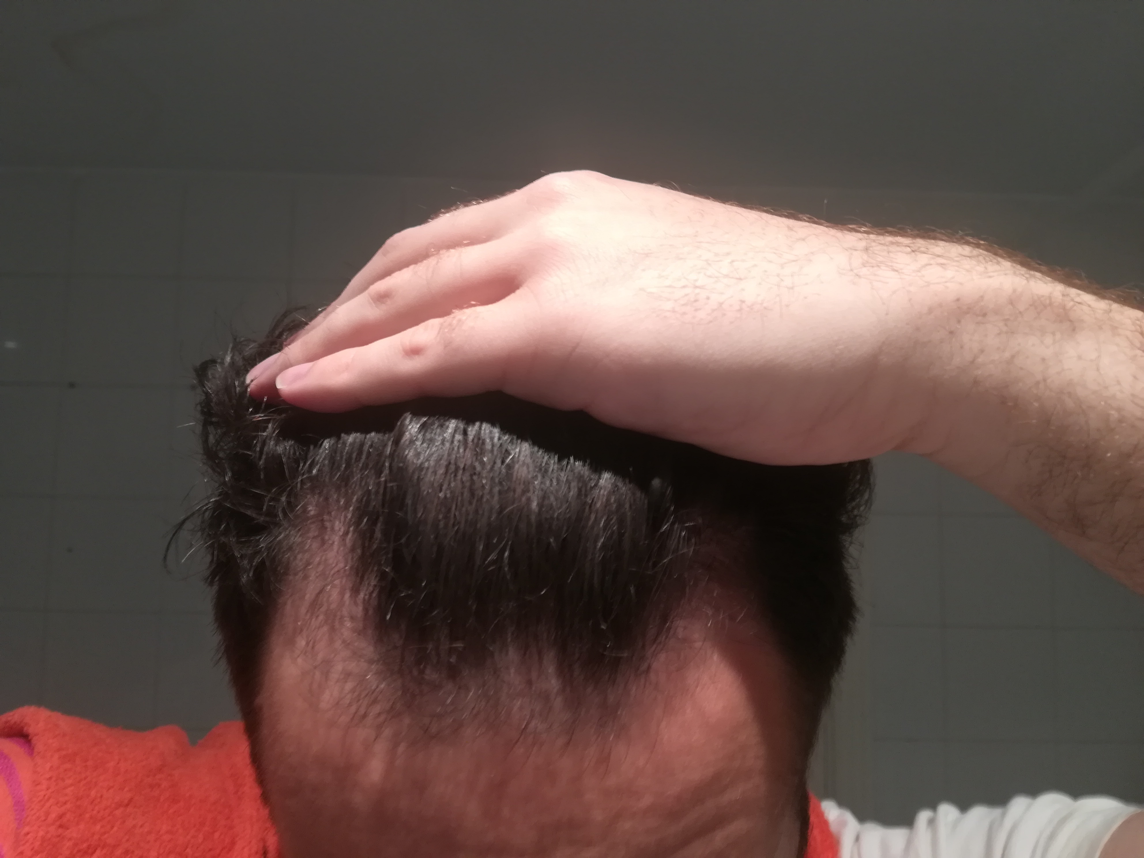 Was ich mir von der HT erhoffe: Ich möchte nicht von heute auf morgen wieder perfekte Haare, sondern einfach einen Status mit dem ich zufrieden bin. Ein Haarstatus mit dem ich voll zufrieden wäre, wäre Geheimratsecken wie jetzt + hinten dicht. Generell ist mir vorne also nicht so wichtig, sondern eher der hintere Bereich. Das kann sich natürlich ändern, wenn es vorne schlimmer werden sollte. Es kommt mir aber so vor, als wäre vorne das Schlimmste vorerst überstanden und nun ist halt der hintere Bereich die neue Problemzone. Momentan würde ich den Status zwar als nervig, aber noch zu früh für eine HT beschreiben (siehe Fotos).