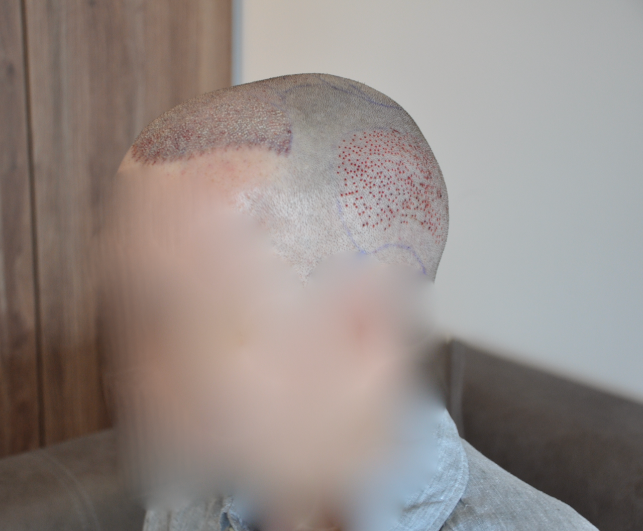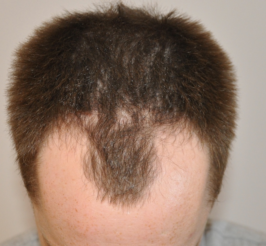 Wir haben uns auf 2000 Grafts verständigt, um primär die Geheimratsecken aufzufüllen und den Mittelpart zwischen den GE aufzufüllen. Die Bereiche dahinter wurden dann in Relation zum bestehenden Haarwuchs immer weniger aufgefüllt, um den bestehenden Haarwuchs nicht zu gefährden, weshalb in der Kopfmitte nur noch vereinzelt Haare eingesetzt wurden. Falls notwendig, muss dann halt in ein paar Jahren eine zweite HT für die hinteren Bereich her, der Spenderbereich sollte wohl genug dafür hergeben.