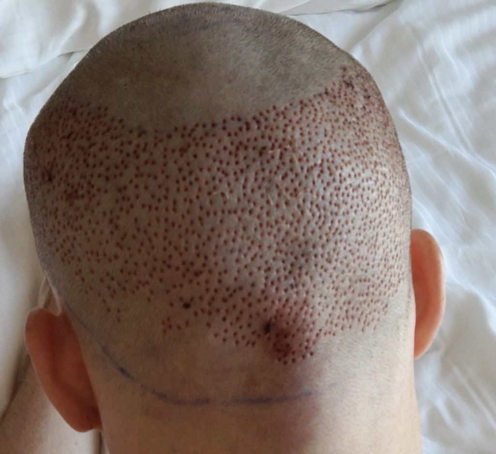 Direkt nach der Entnahme ist auch relativ. Ich hab bei Clemens Weber von Health Travels nachgefragt. Er hat mir versichert, dass Dr. Demirsoy und Dr. Sahinoglu beide mit Punches zwischen 0,8 und 1mm arbeiten. Der Unterschied in der Optik kommt dadurch zustande, dass der erstgenannte Arzt den Spender nach der OP verbindet und Tags darauf waschen lässt, bevor die Fotos gemacht werden.