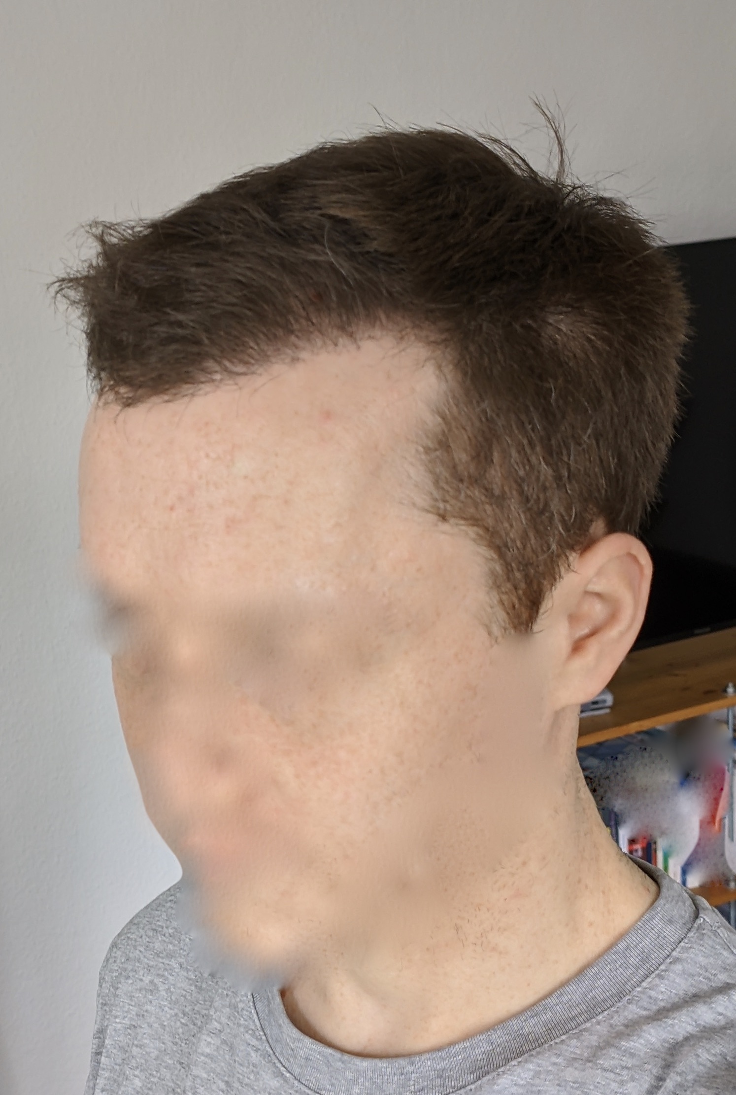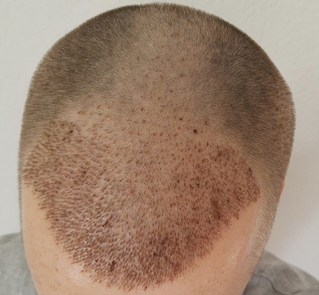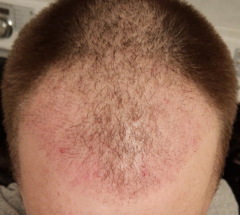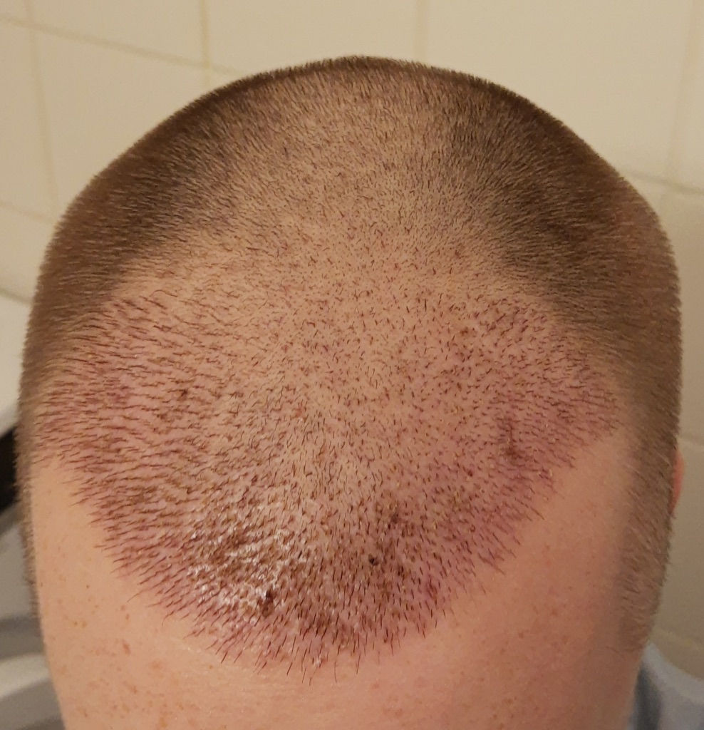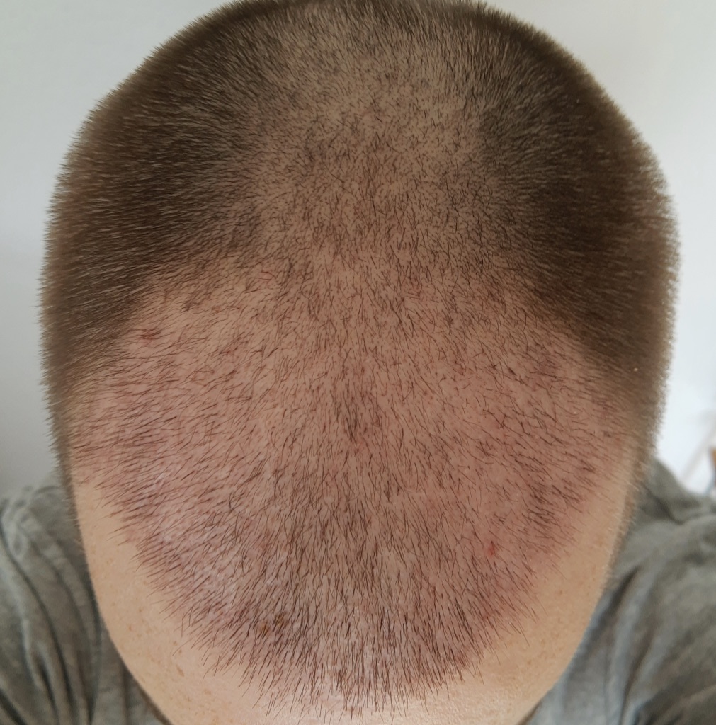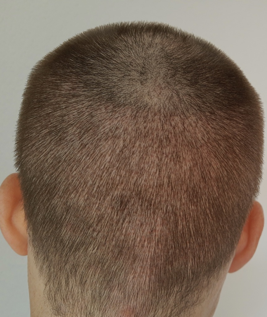 - Dadurch sieht der Empfängerbereich bereits jetzt zunehmend dünner aus, was ich auch nicht so schnell erwartet habe. Ich werde jetzt erstmal abwarten. Aber wo die Haare an den Seiten und auch im Donor wieder gut wachsen, kann ich mir vorstellen, zu Woche 4 wieder alles mal auf eine ähnliche Grundlage zu stutzen (wenige mm lang), bevor das Haarwachstum dann irgendwann wieder ansatzweise überall einsetzt. Denn sonst sieht das irgendwann sehr seltsam aus, glaube ich.